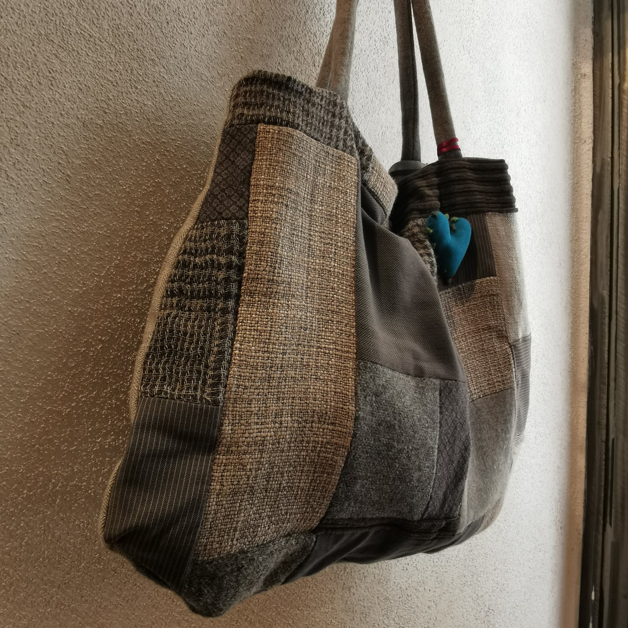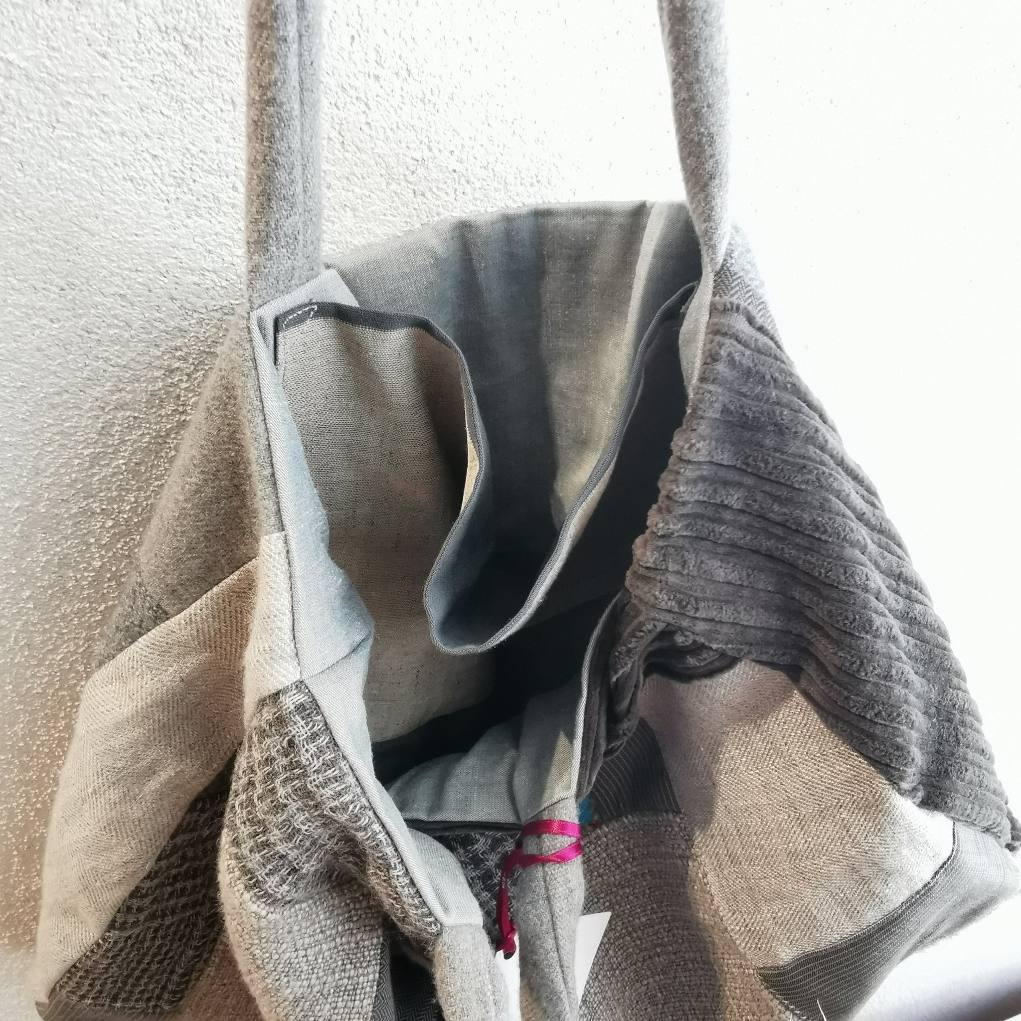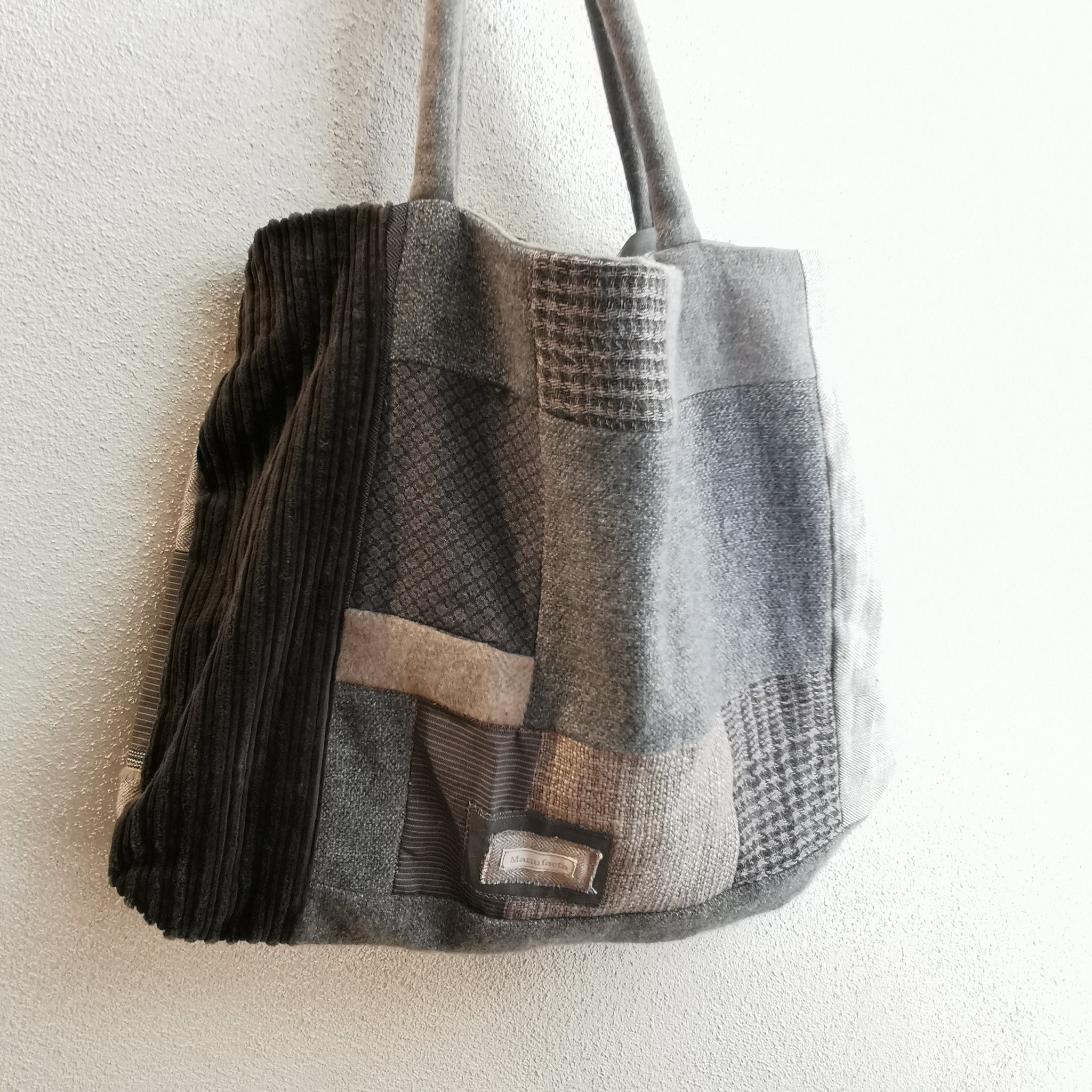 Borsa leggermente trapezoidale, è realizzata con tantissimi pezzetti di tessuti sulla scala dei grigi sono lane lini e cotone le caratteristiche di questa borsa sono la leggerezza, la morbidezza dei tessuti, con fodera in cotone sempre in tono e tasca interna, .