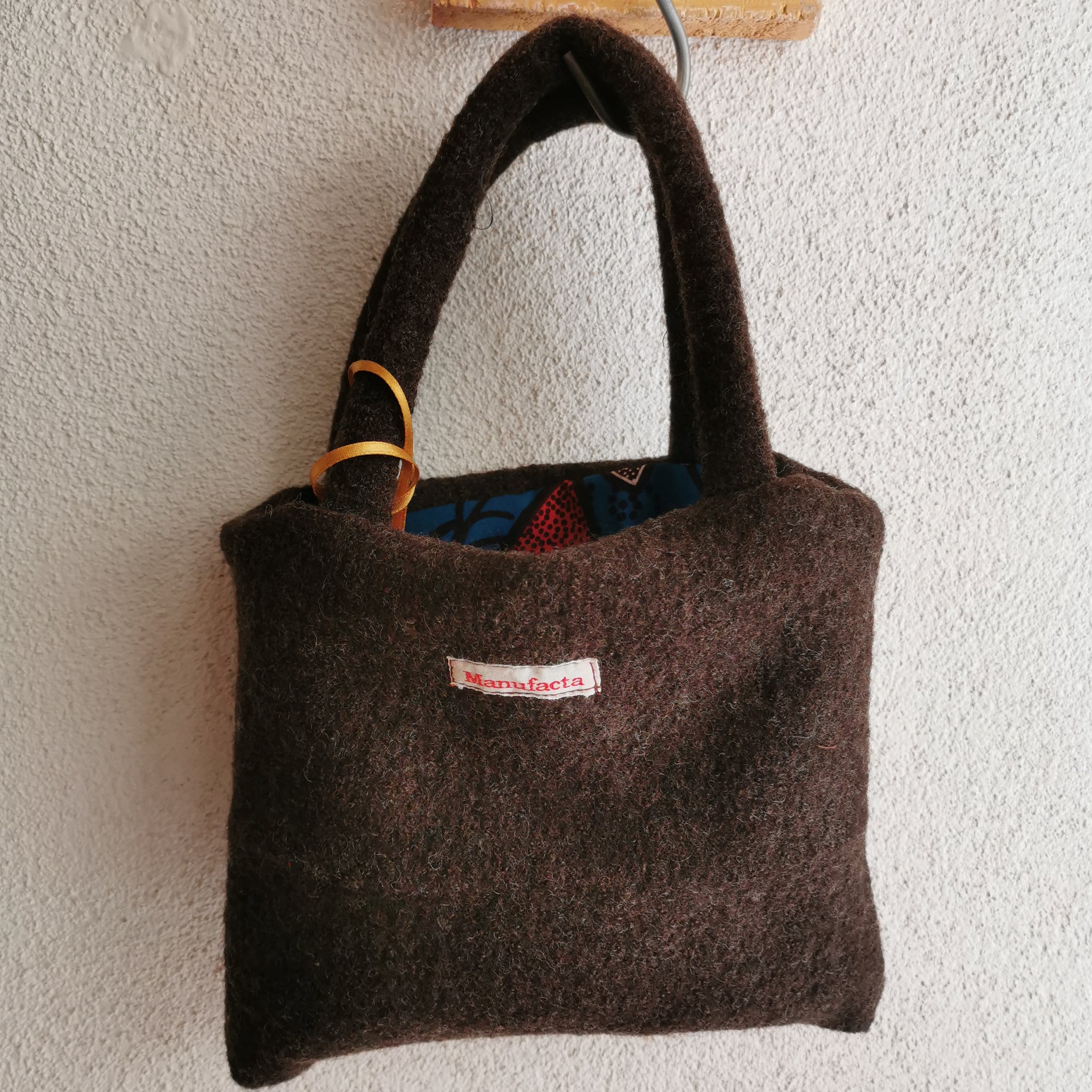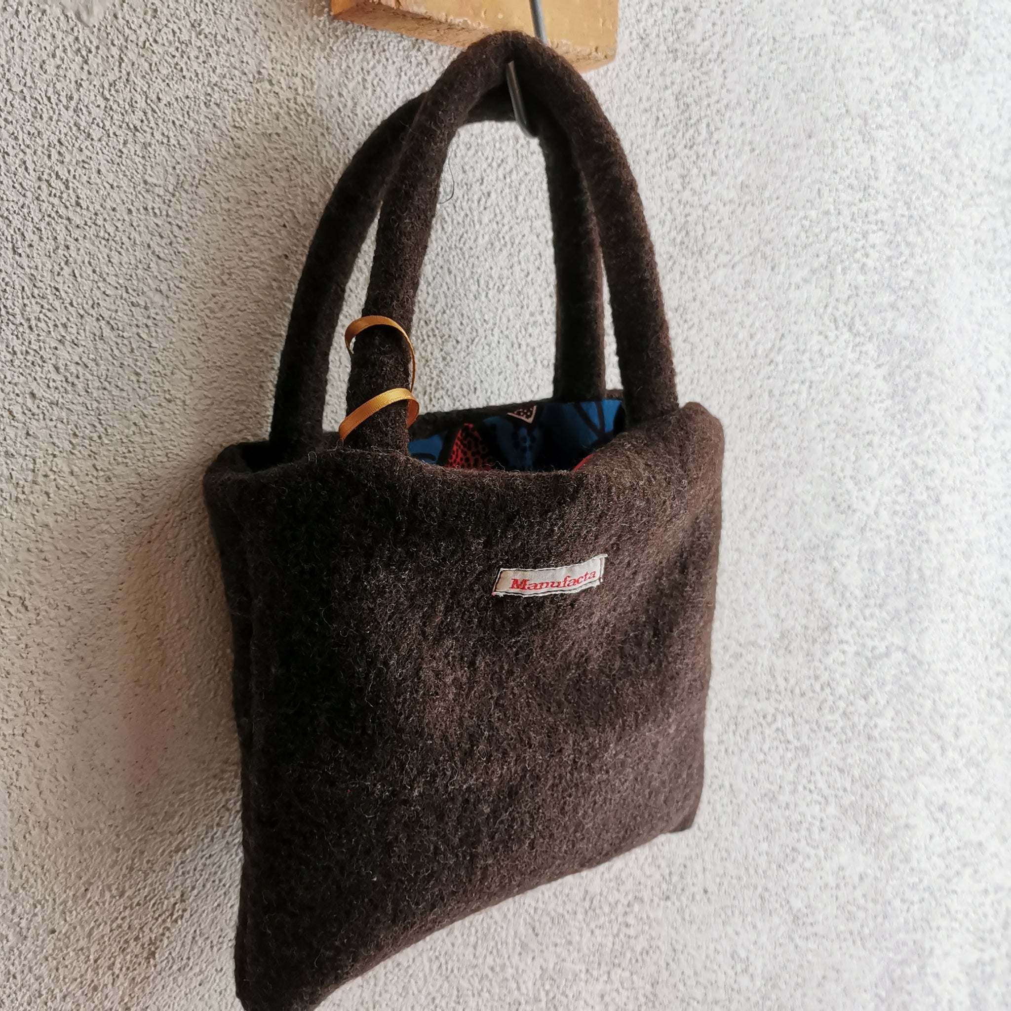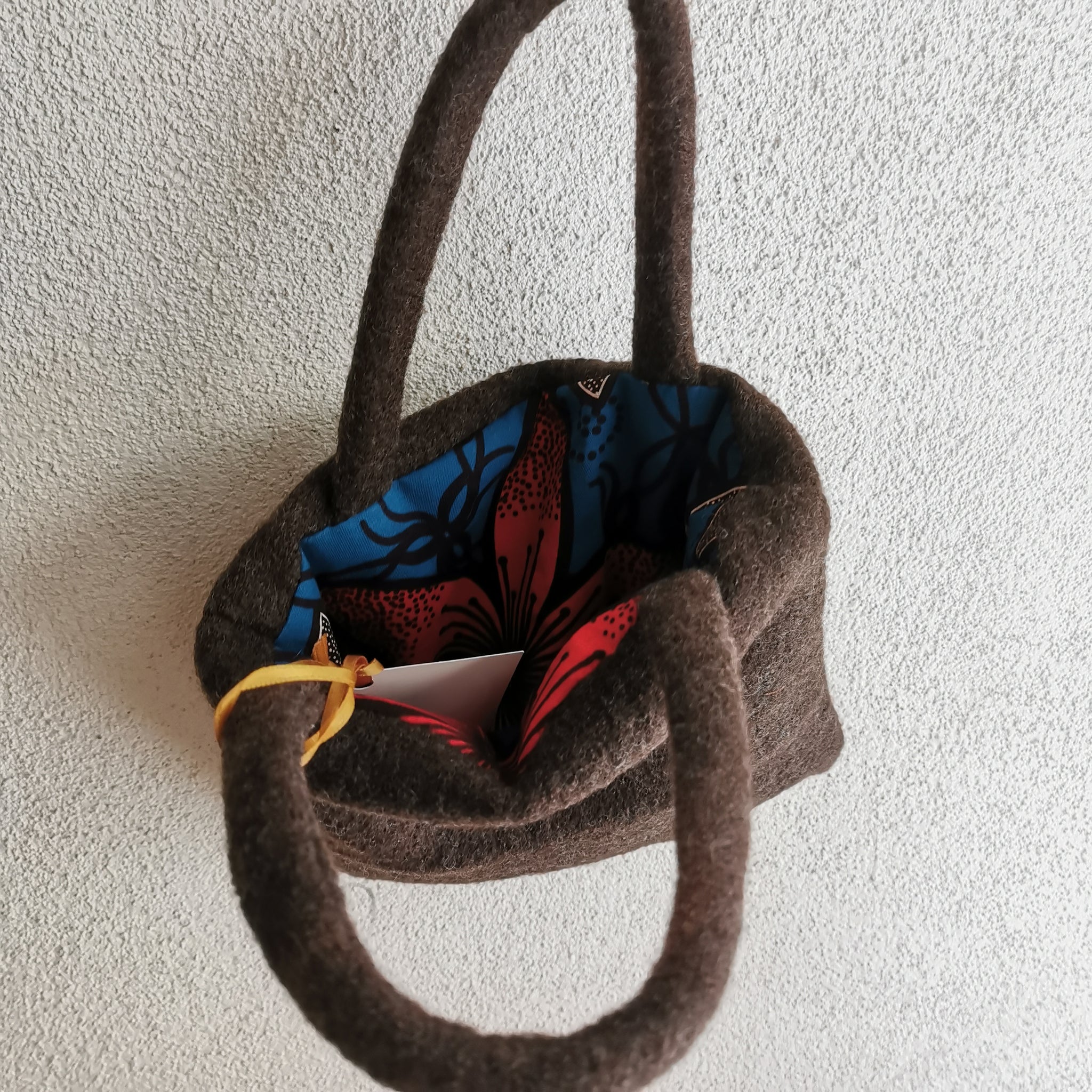 Borsetta da mano o polso in lana cotta testa di moro, i manici sono nello stesso tessuto, la fodera é un cotone africano a disegni floreali petrolio e rosso.