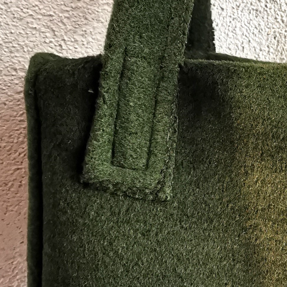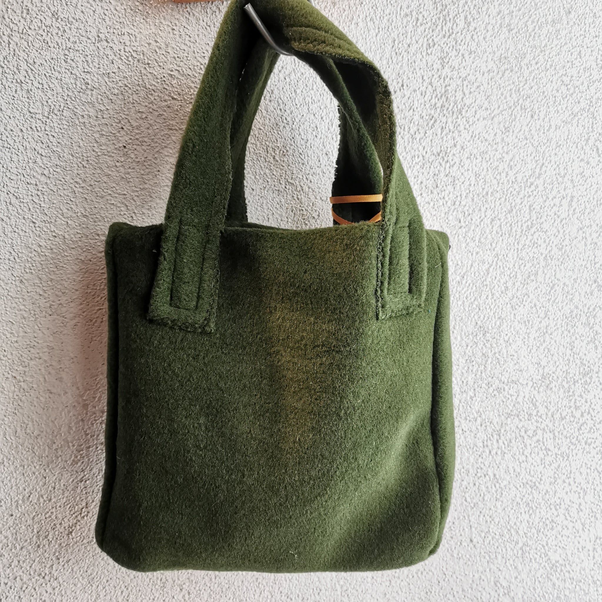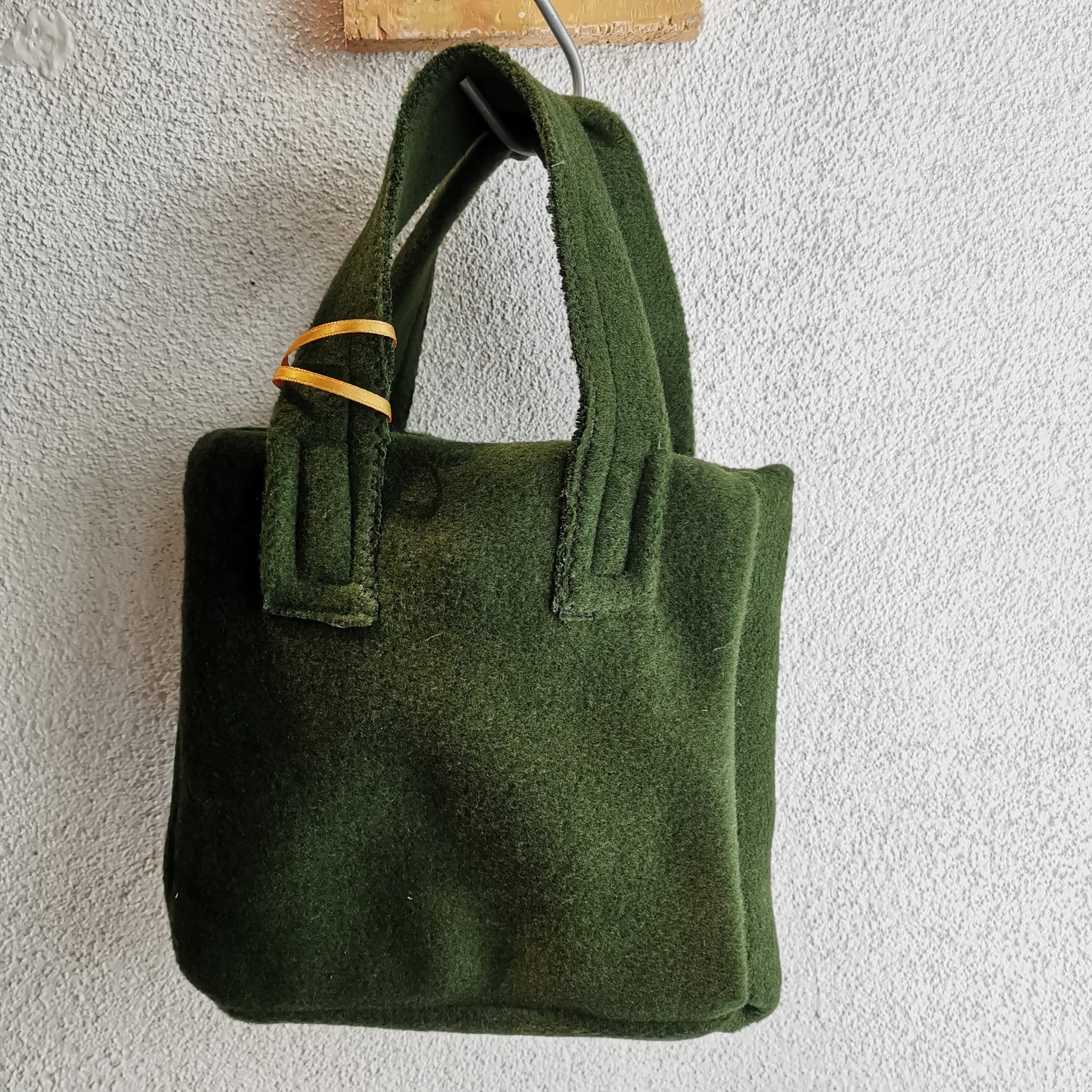 Borsetta da mano o polso in lana verde prato, i manici sono nello stesso tessuto, cuciti all'esterno e finiti a zig zag, la fodera é una lana color ruggine.