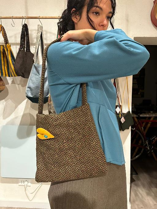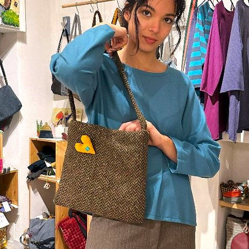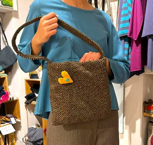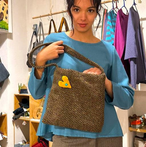 Borsetta a spalla in lana spigata verde/rosso, foderata, con una tasca e chiusura a calamita, leggerissima e pratica. La spilla decorativa a forma di cuore più essere tolta ( il prezzo diminuisce di 5€ ) o cambiata con un altra