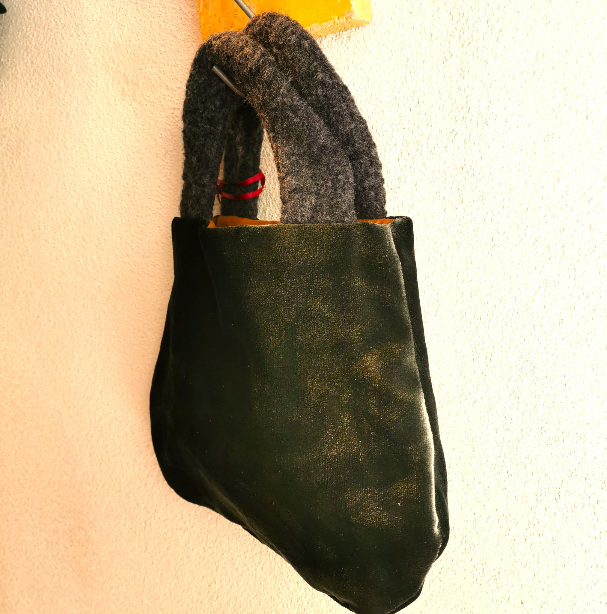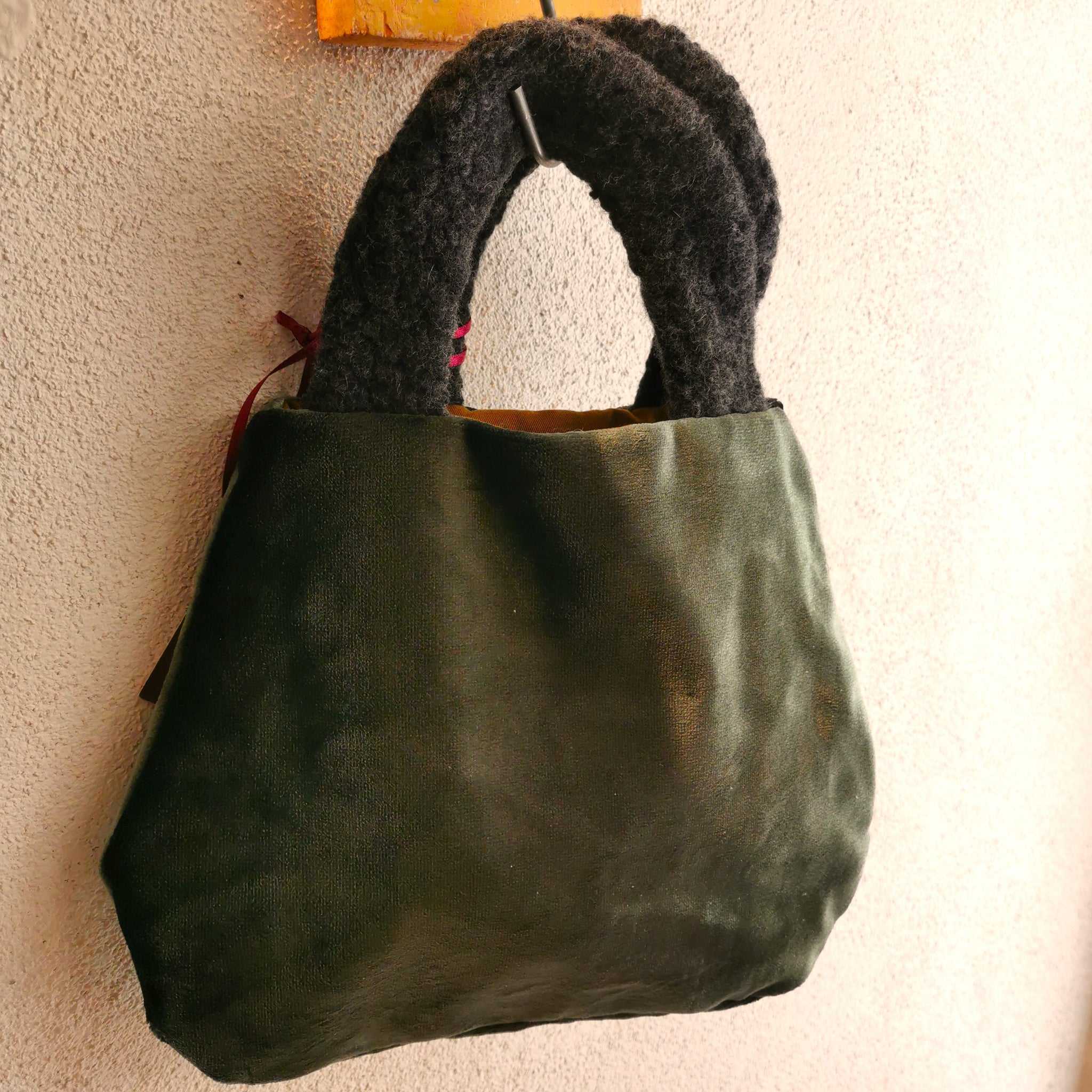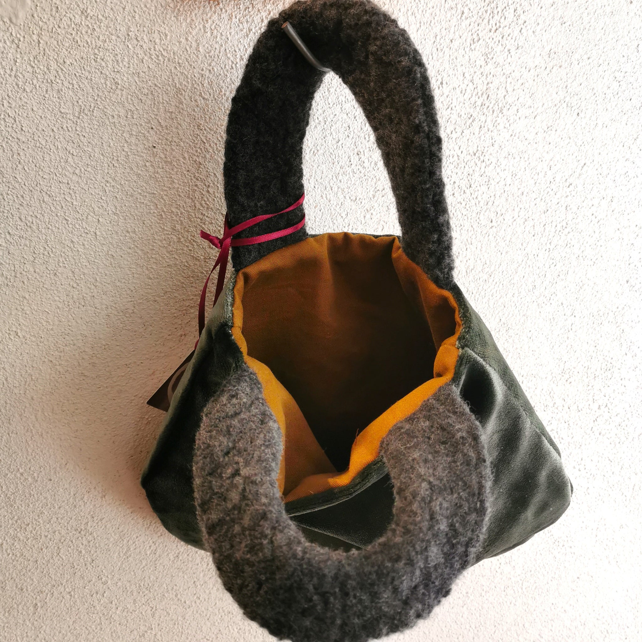 Borsetta da mano o polso in velluto verde olivo, i manici a semicerchio sono nello di lana cotta, la fodera é un cotone color senape, giocata sui contrasti dei materiali e sulla particolarità della forma.