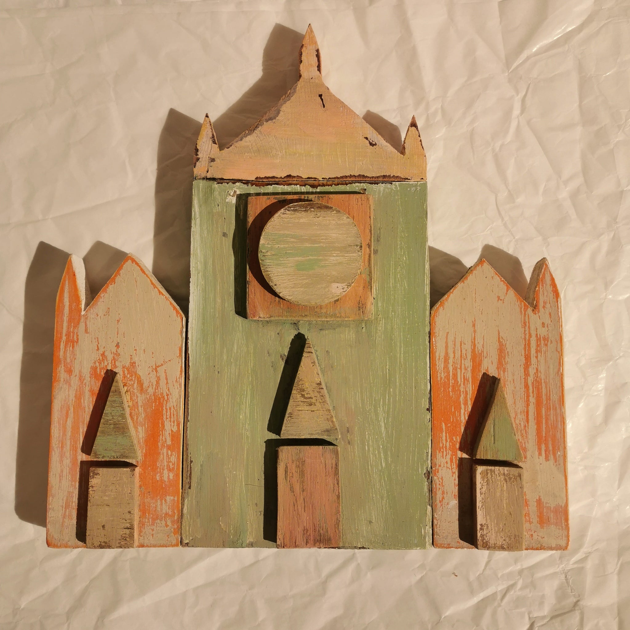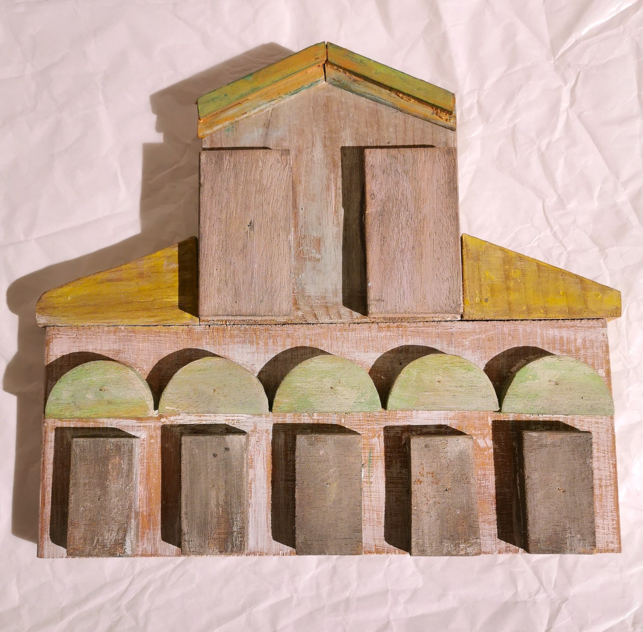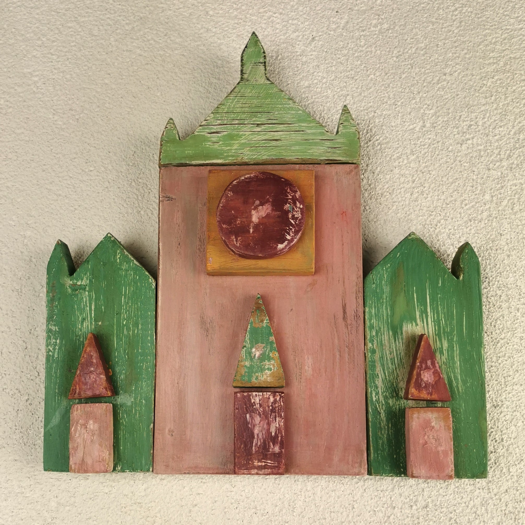 Monumenti in legno di riciclo realizzati a mano, rappresentanti facciate di famose chiese di Firenze, sono oggetti da appendere al muro.