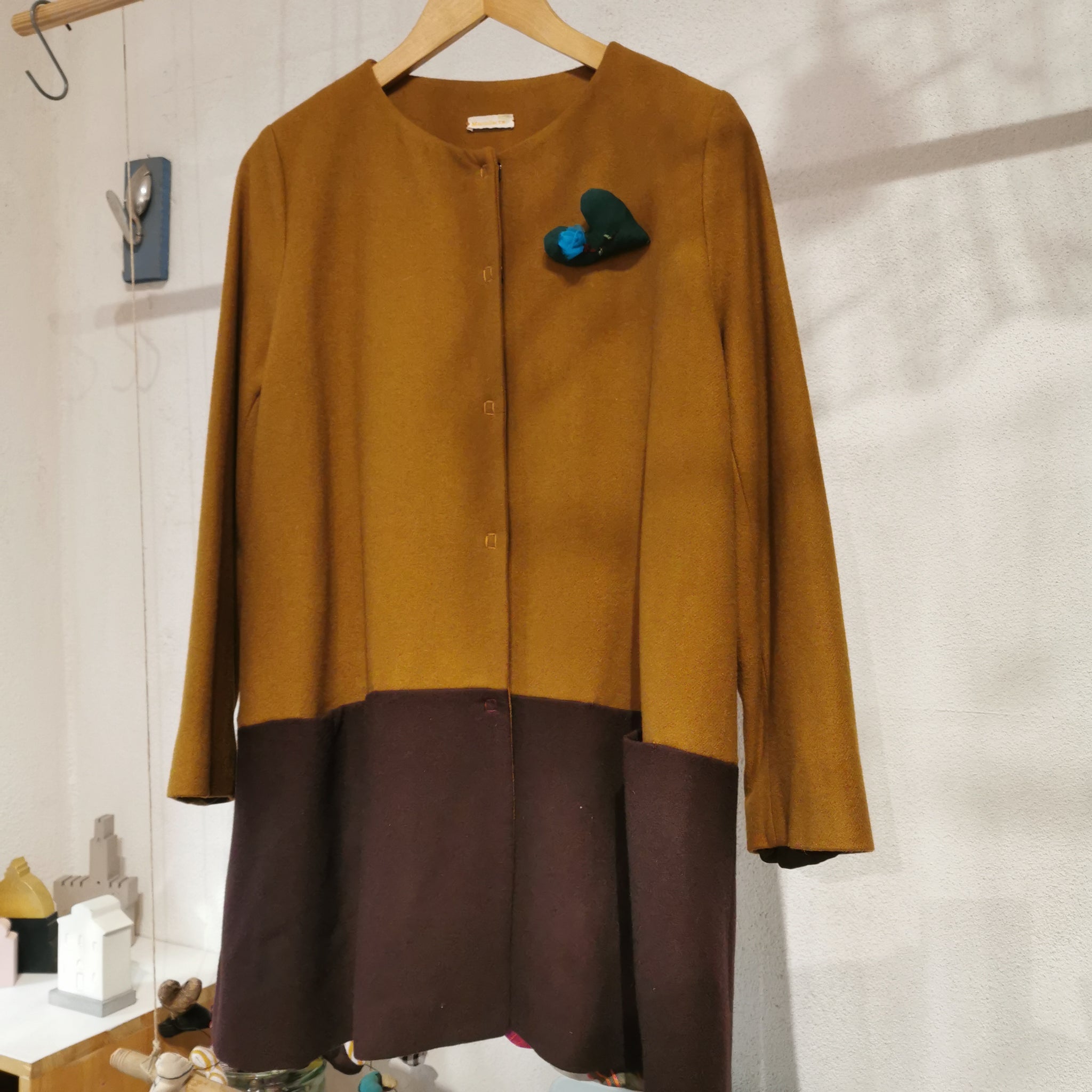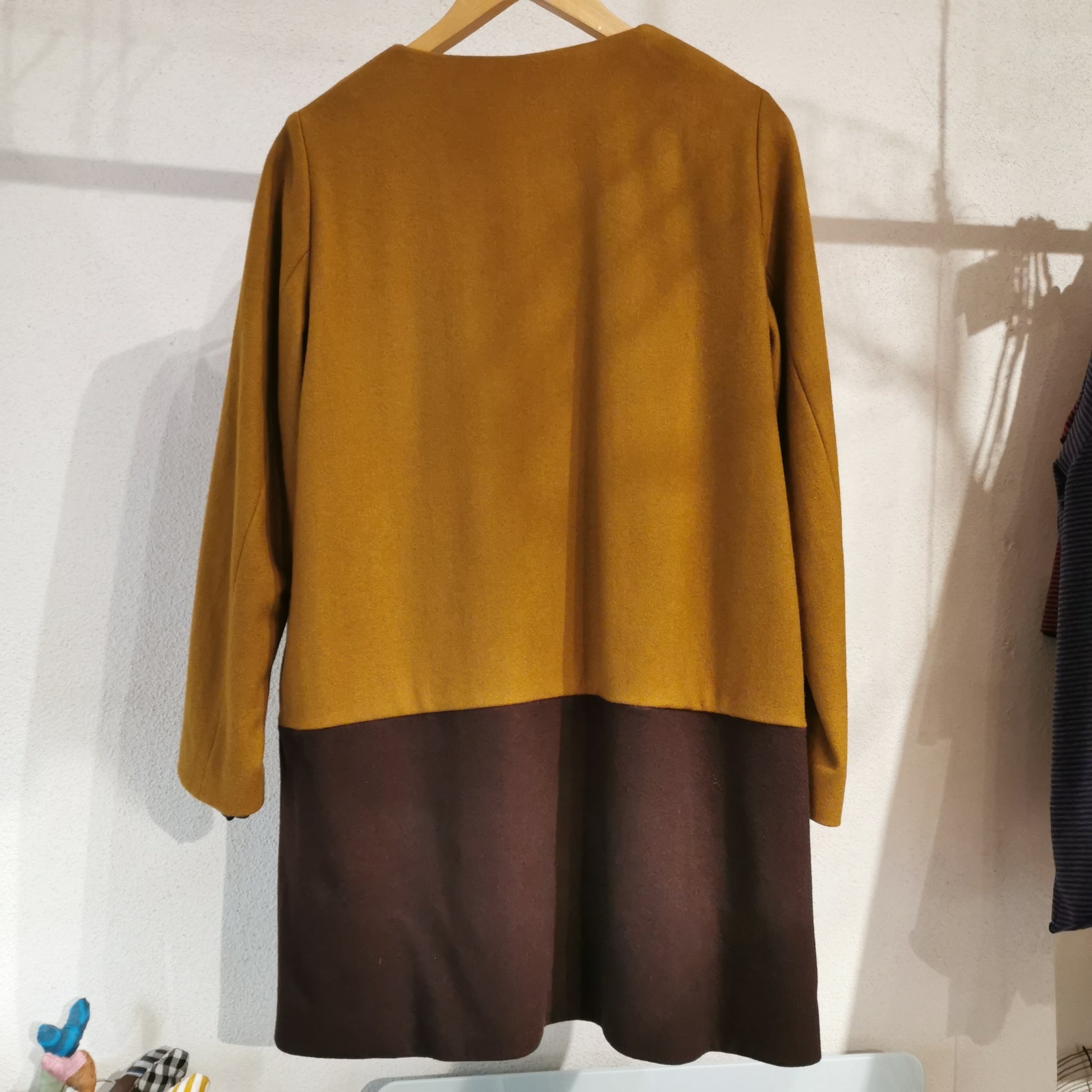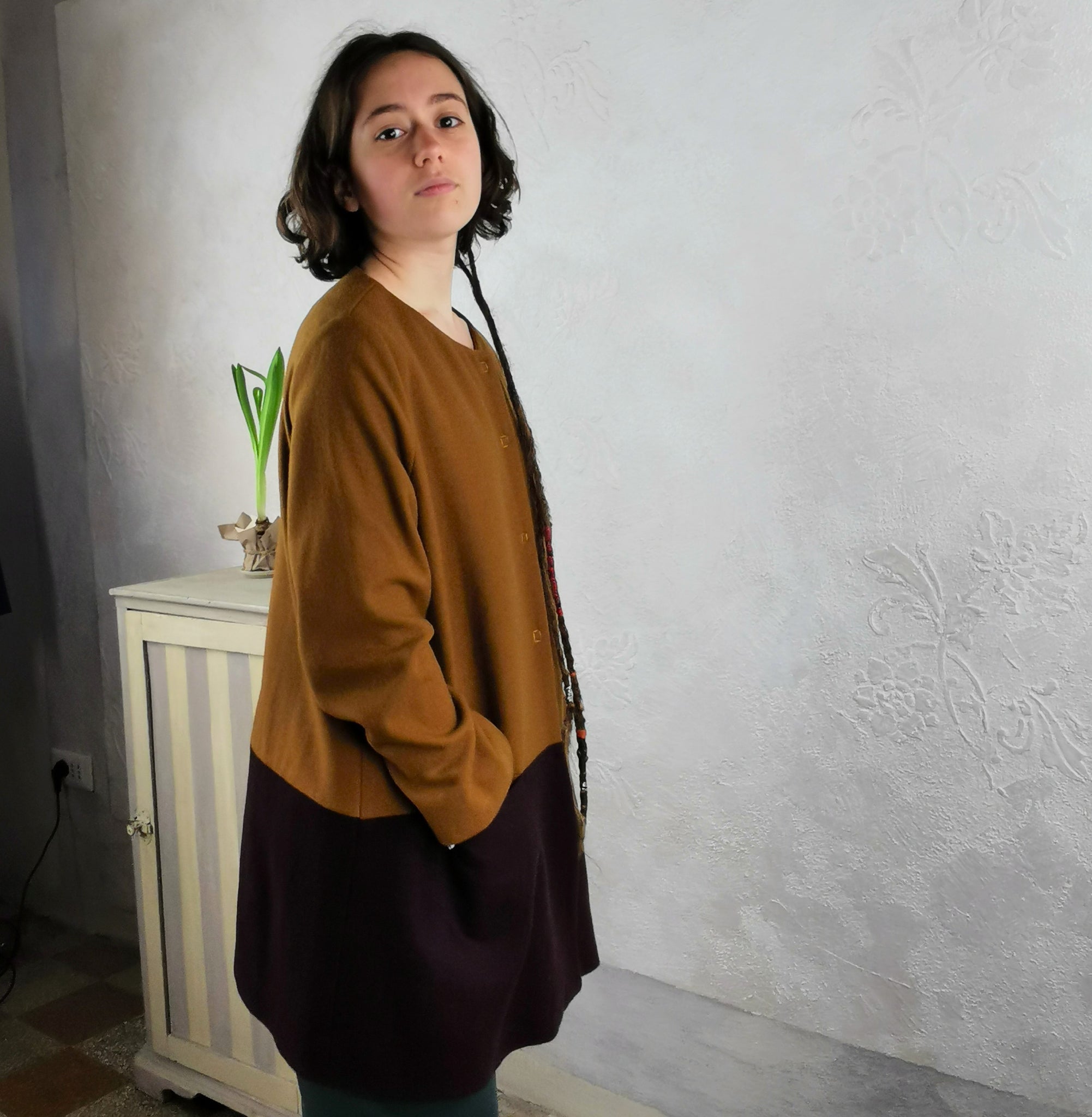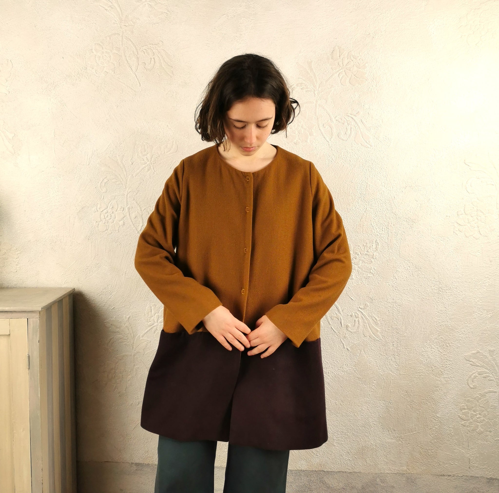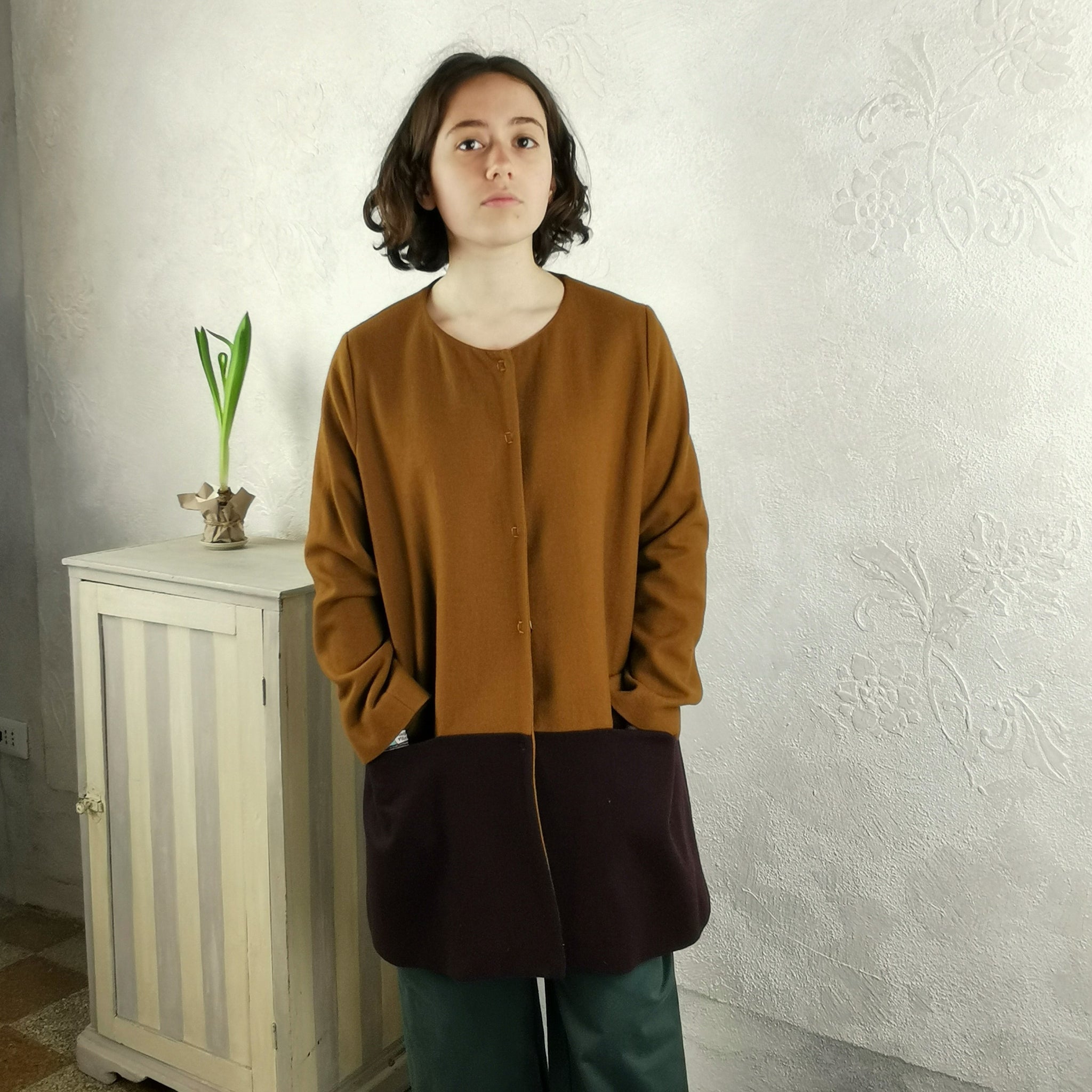 Giacca monopetto a taglio svasato con tasche a taglio, collo tondo, maniche lunghe, interno foderato in viscosa. La chiusura è con bottoni automatici. Questa versione è in un tessuto di lana, caratterizzata dalla scelta di due lane con colori a contrasto: senape e vinaccia, questo capo leggero e pratico veste corpi con forme diversi.