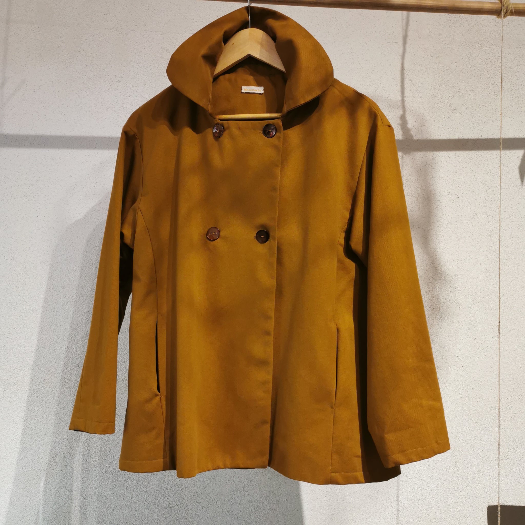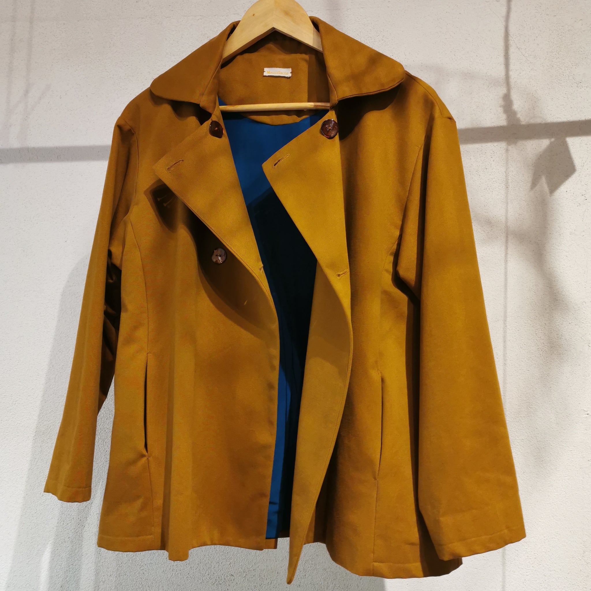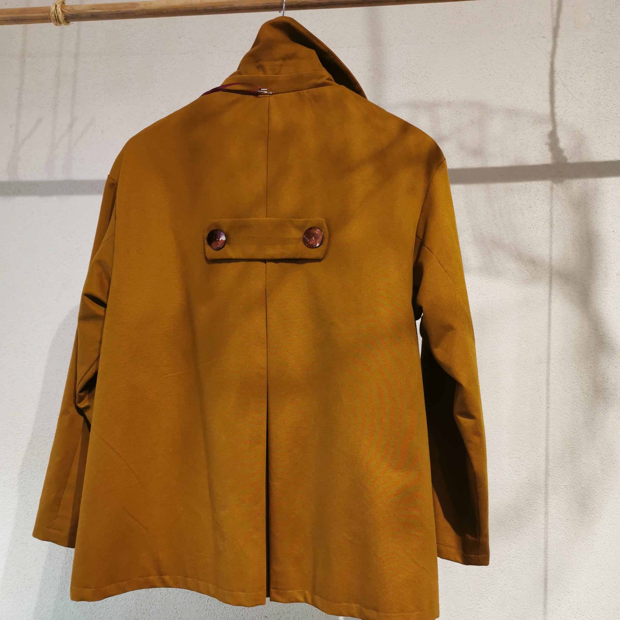 Giacca doppio petto leggermente svasata con tasche a taglio, maniche lunghe, interno foderato, con martingala e bottoni di madreperla. Queste versioni sono in caldo cotone perfette per le mezze stagioni. Ogni pezzo ha la fodera e i bottoni di colore diverso.