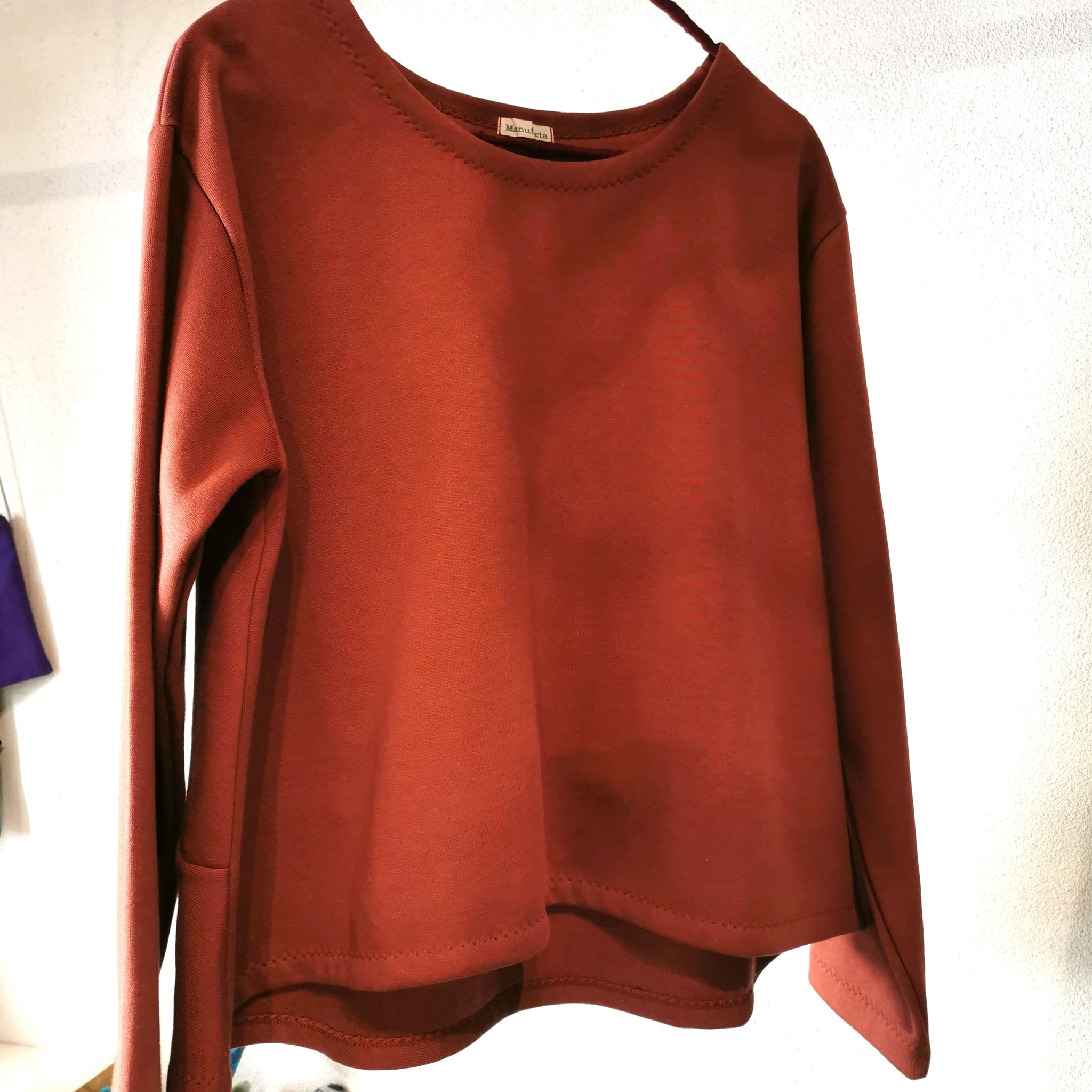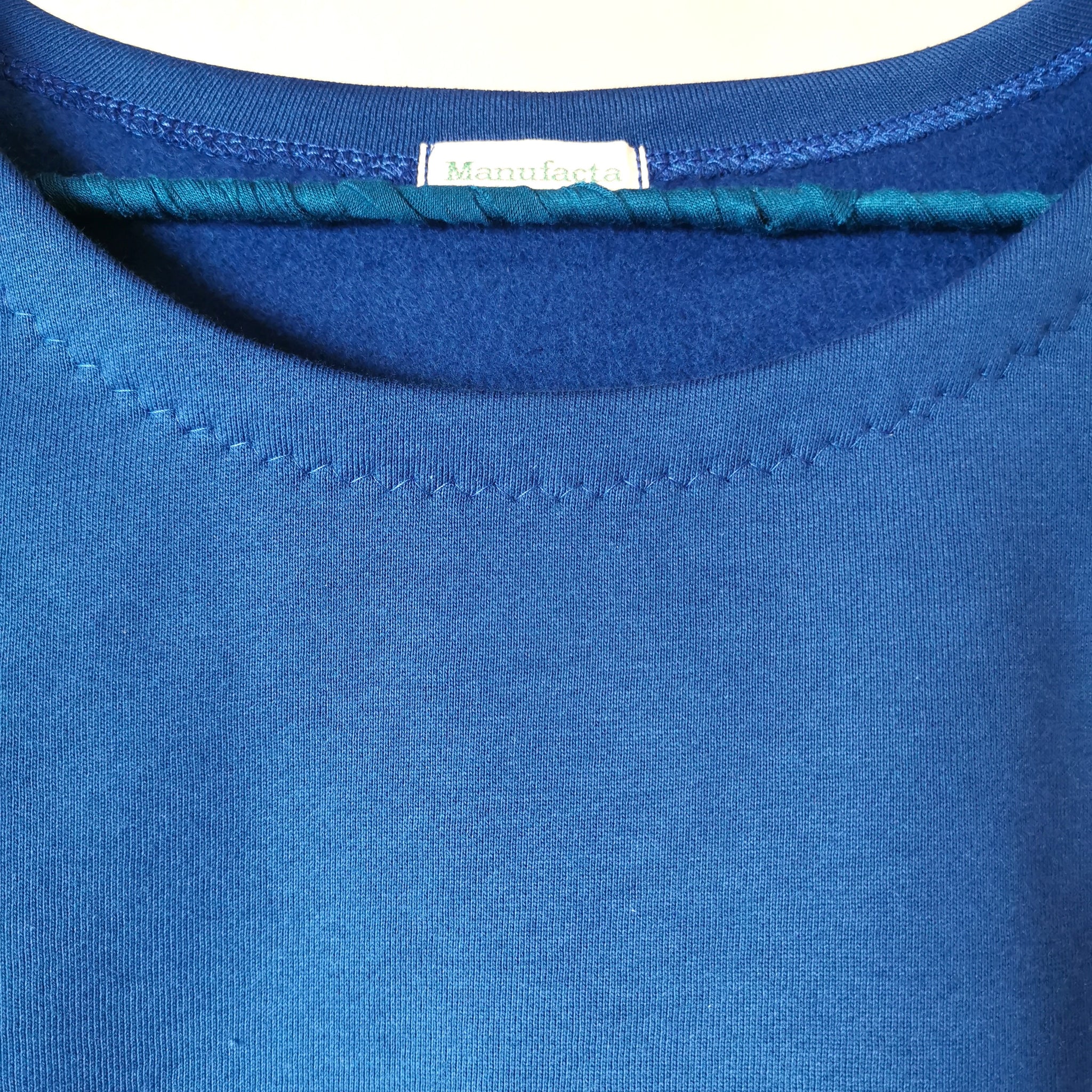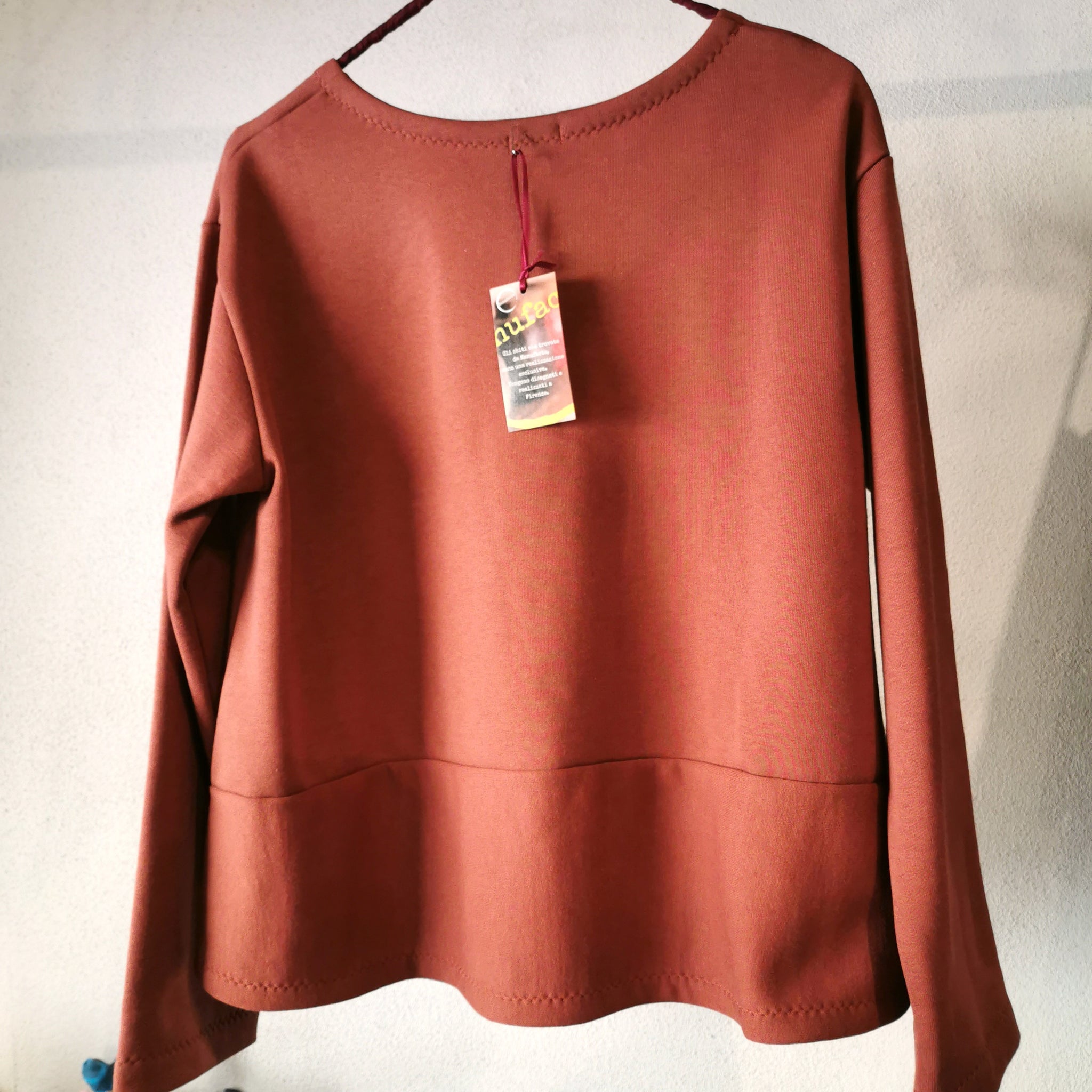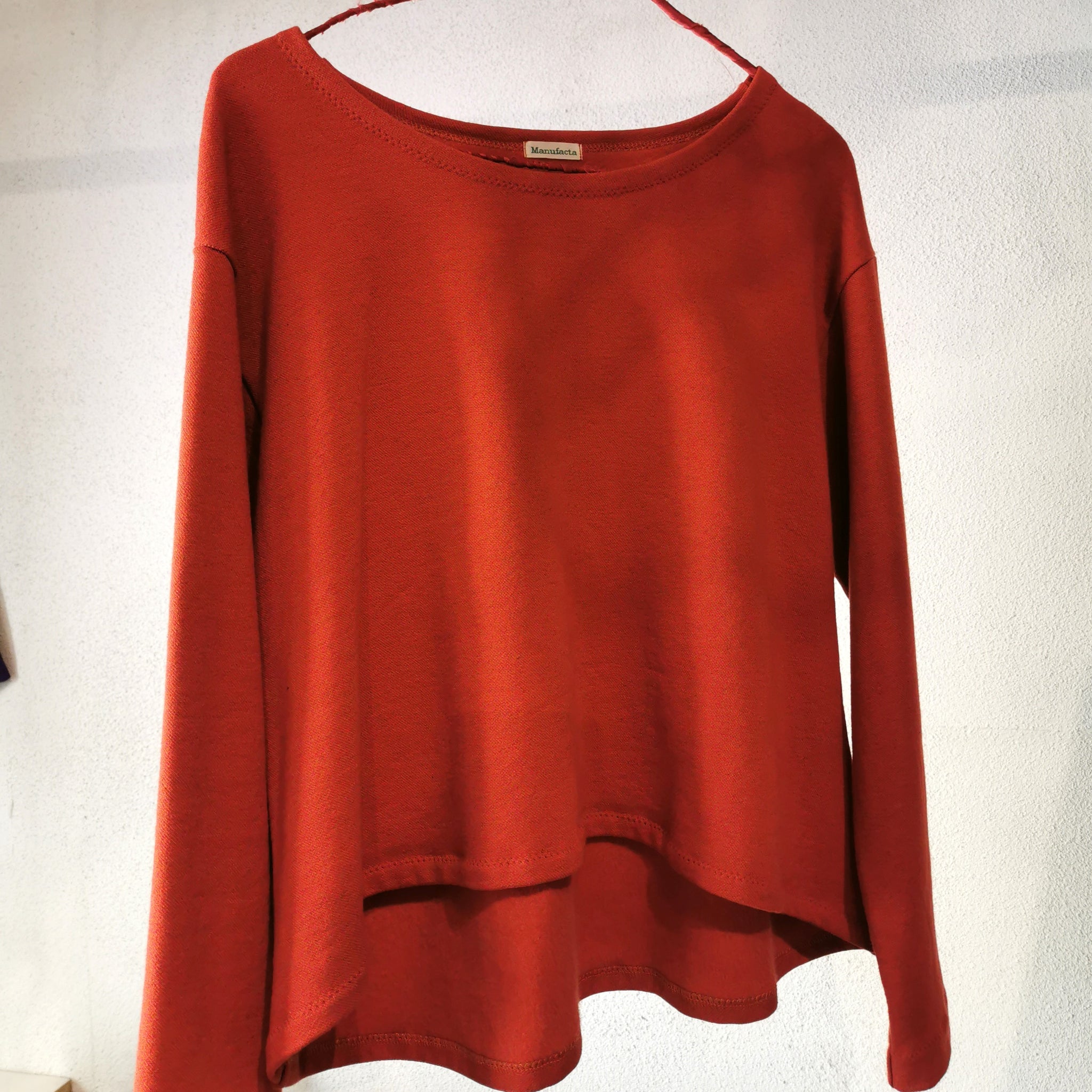 Maglia larga con collo tondo, la manica è lunga, questo modello è svasato e veste in modo morbido senza aderire, la parte dietro è più lunga rispetto al davanti e ha una fascia orizzontale che crea movimento, per questo veste donne di forme molto diverse. I tessuti sono tutti in calda felpa di cotone 100 %. Le taglie sono la M che veste fino alla 42/44 e la L che veste fino alla 46/48, ma possono essere sviluppate taglie ulteriori.