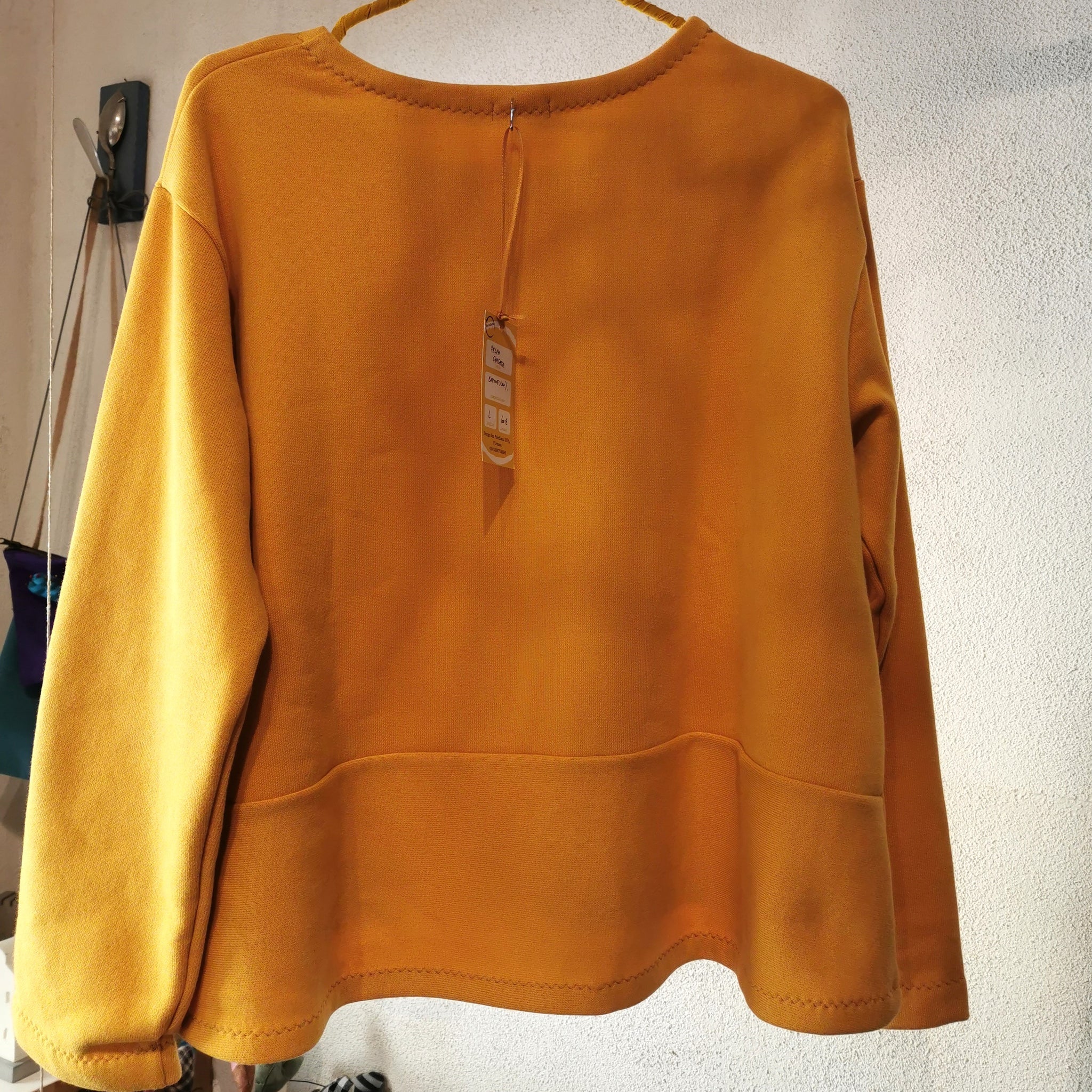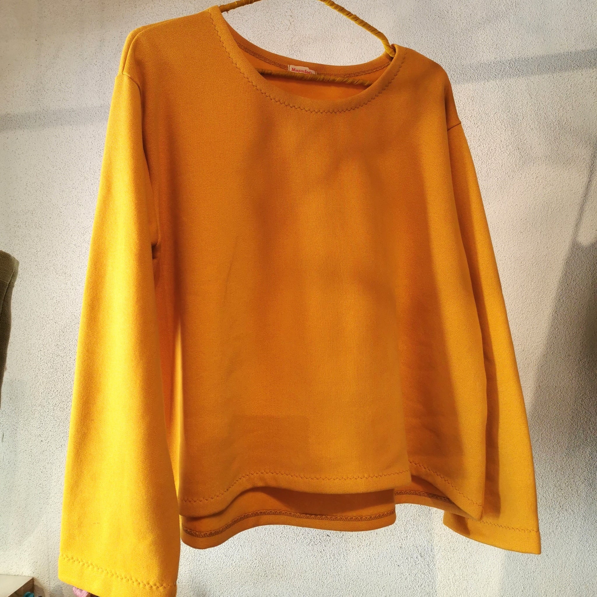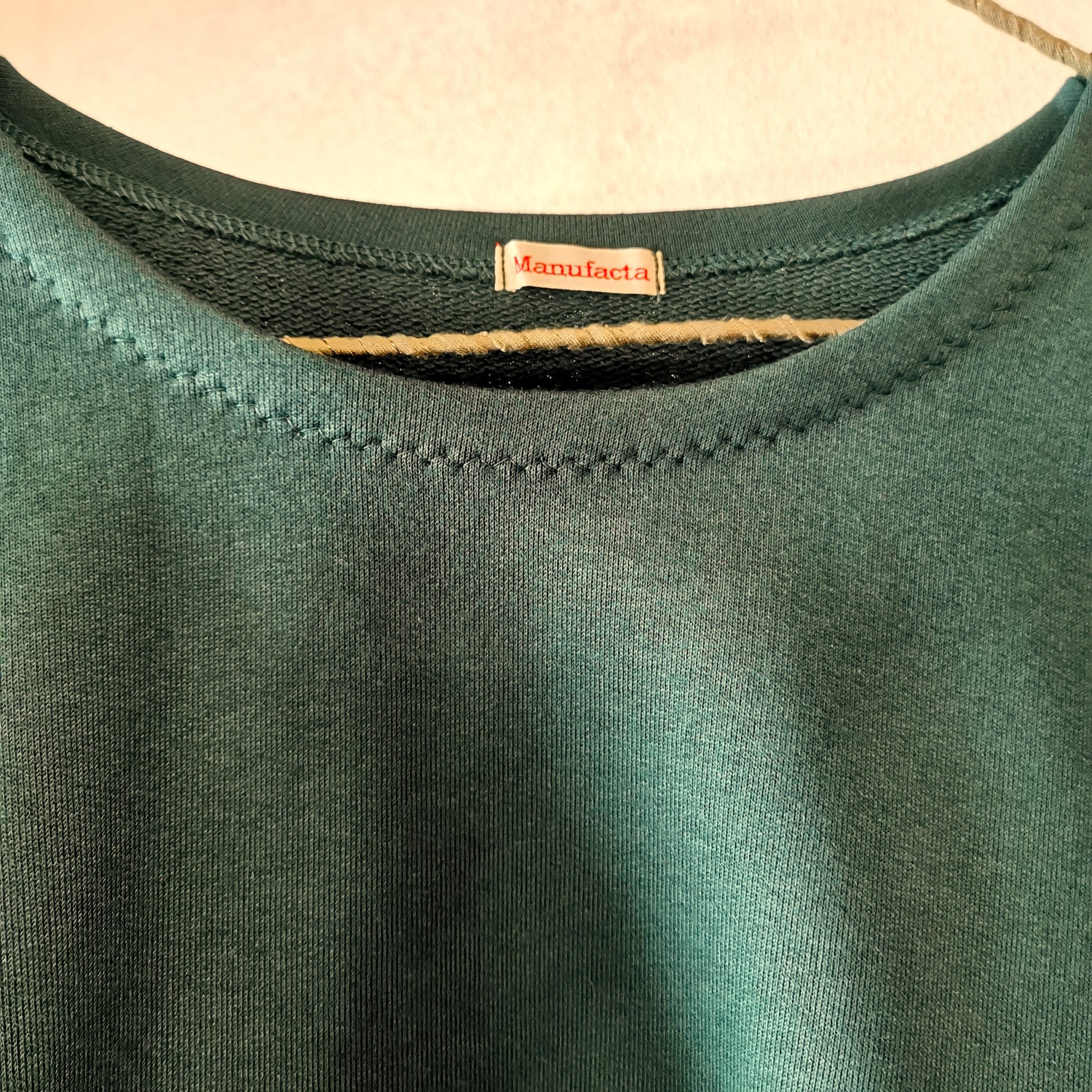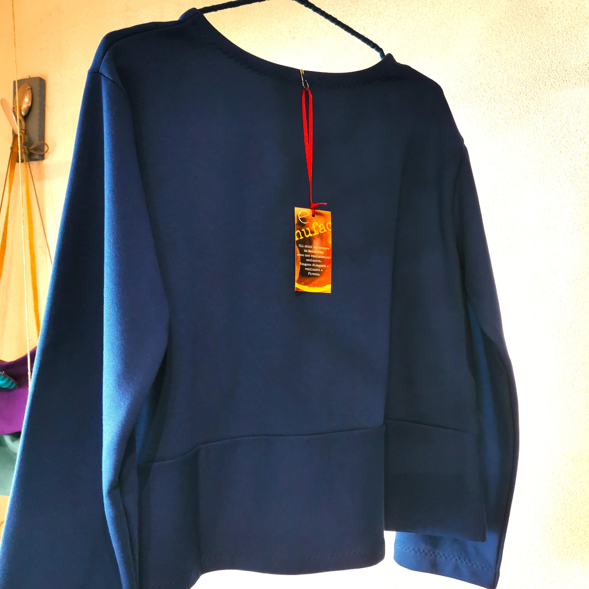 Maglia larga con collo tondo, la manica è lunga, questo modello è svasato e veste in modo morbido senza aderire, la parte dietro è più lunga rispetto al davanti e ha una fascia orizzontale che crea movimento, per questo veste donne di forme molto diverse. I tessuti sono tutti in calda felpa di cotone 100 %. Le taglie sono la M che veste fino alla 42/44 e la L che veste fino alla 46/48, ma possono essere sviluppate taglie ulteriori.