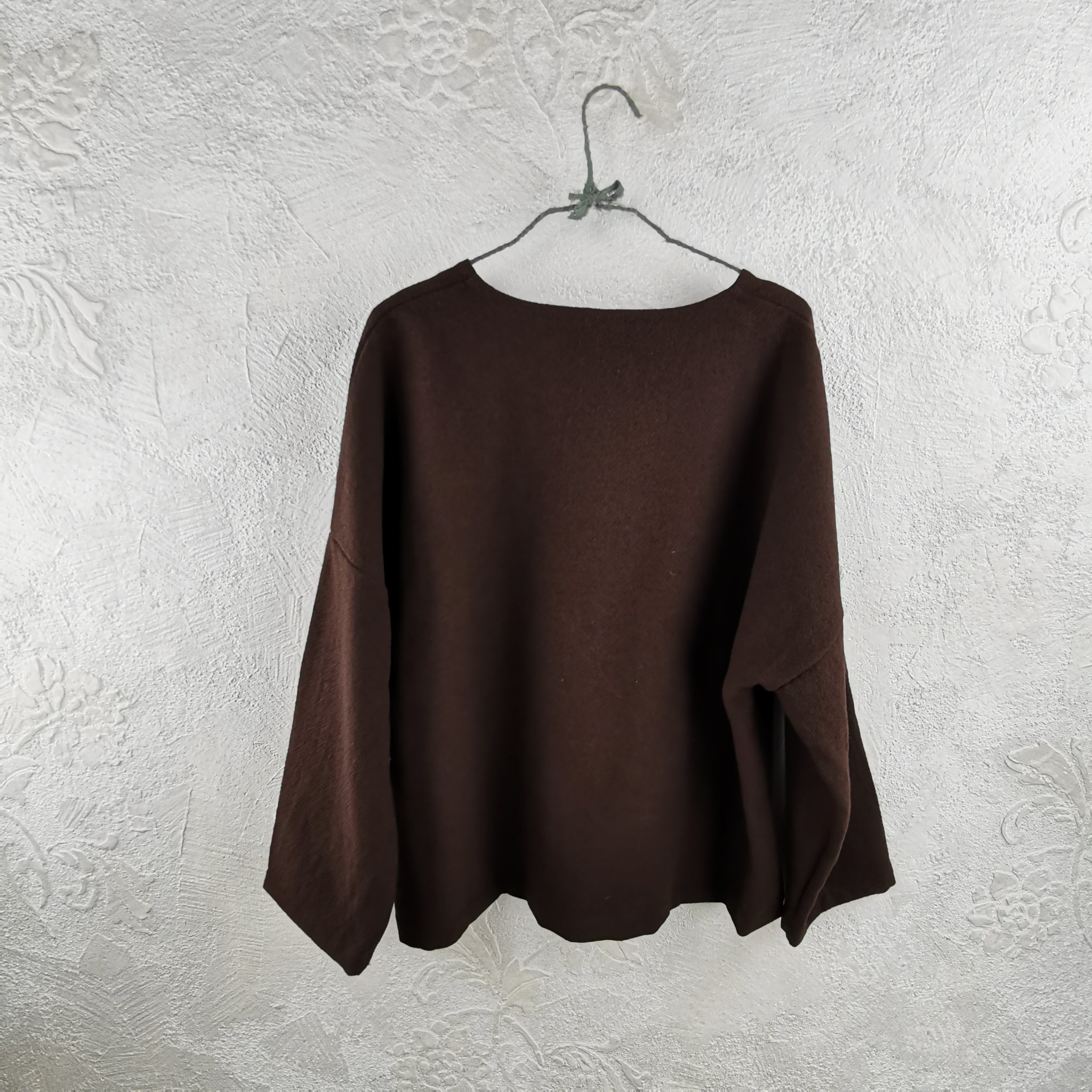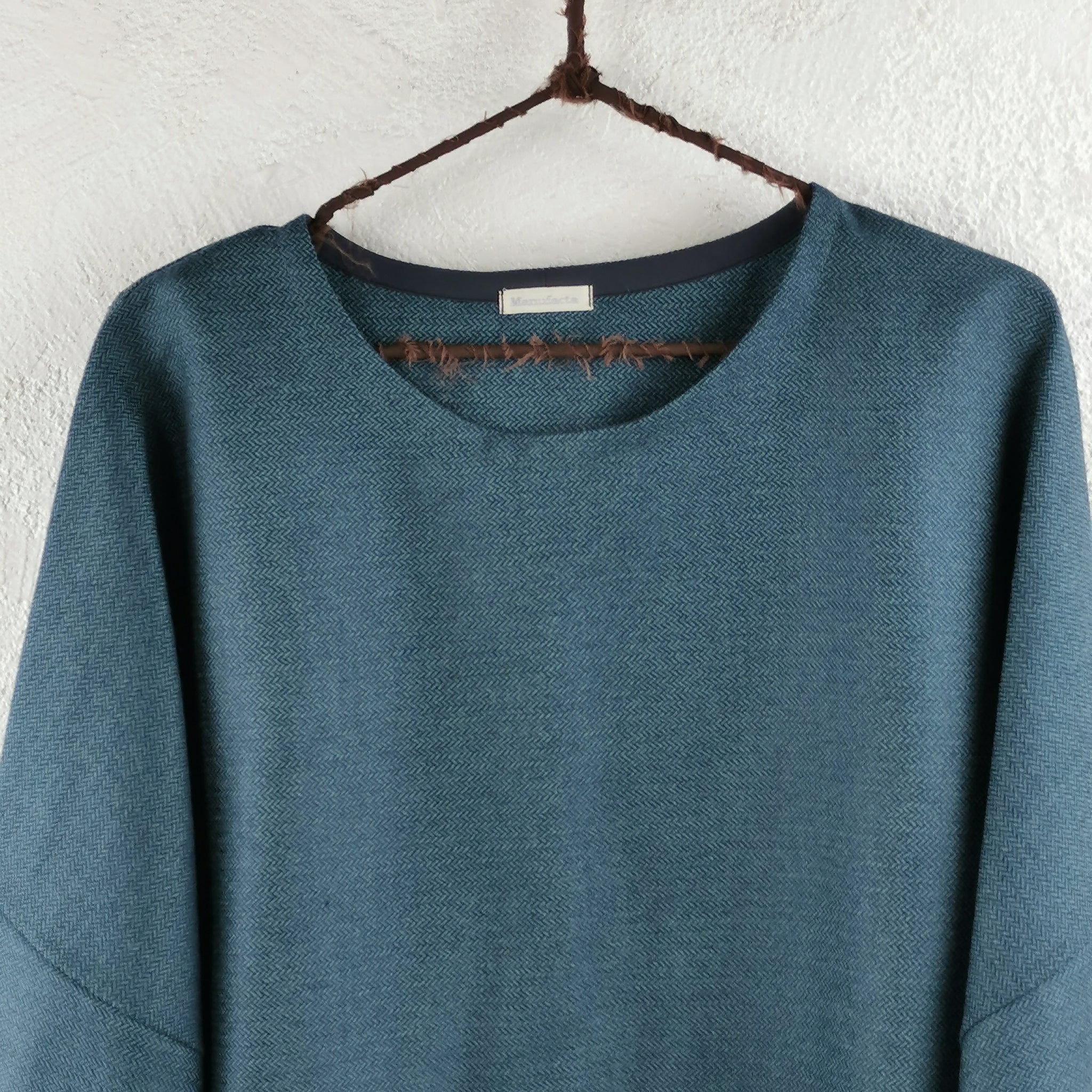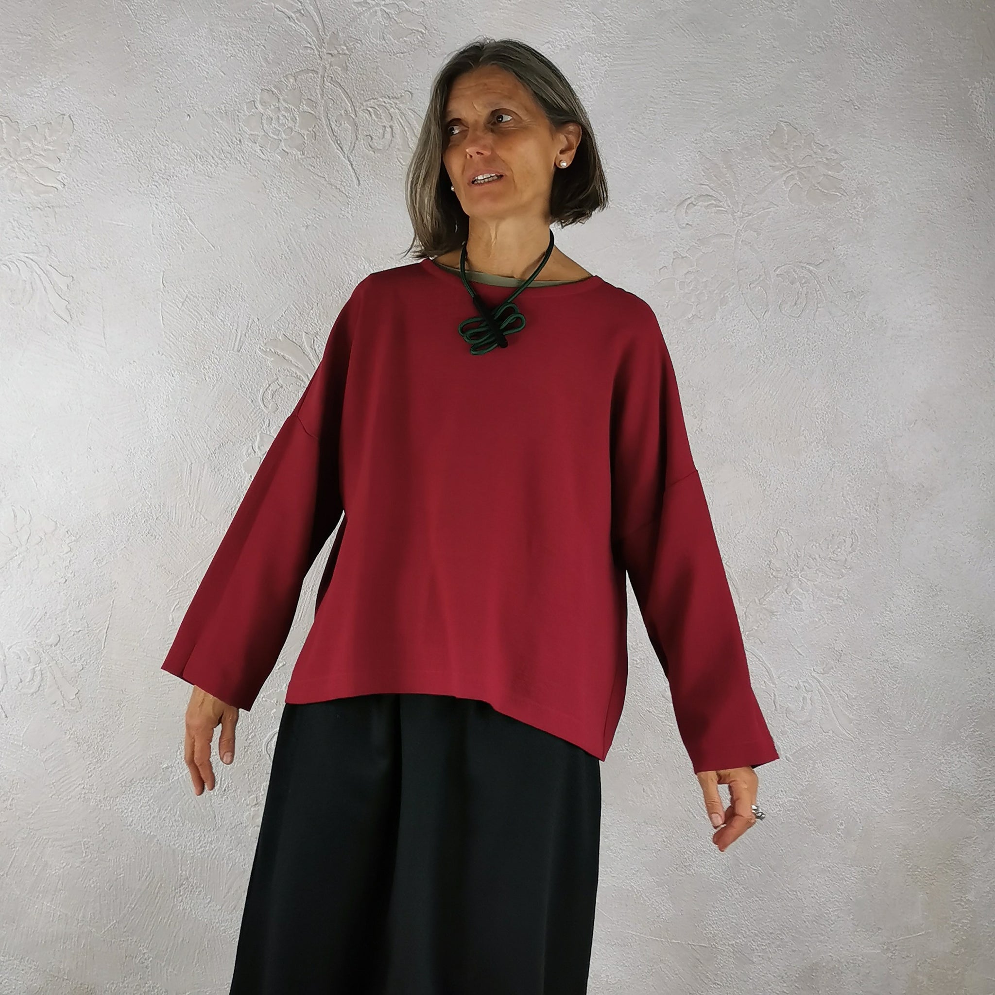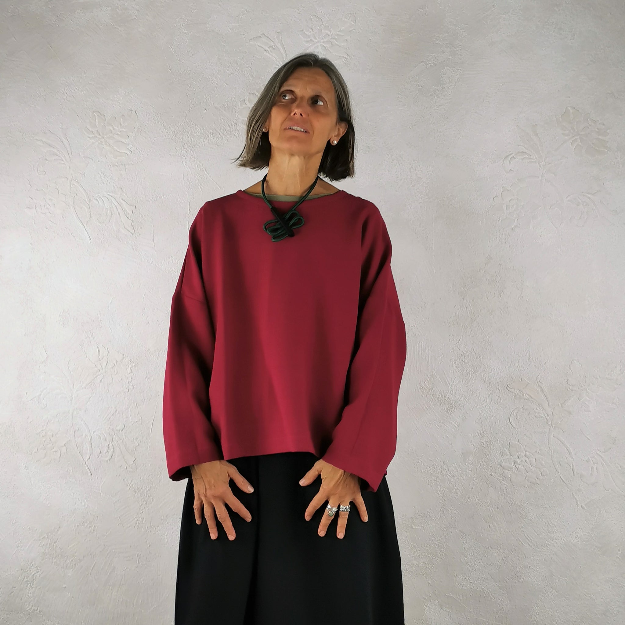 Maglia larga con collo tondo rifinito con bordino di cotone, la manica è lunga, un modello ampio che veste in modo morbido senza aderire, per questo veste donne di forme molto diverse. I tessuti sono tutti in lana 100 %. Questo modello si presta anche ad essere portato sopra alle " camicie dritte " della stessa collezione, che possono essere in mussolina di cotone o in lana leggera.