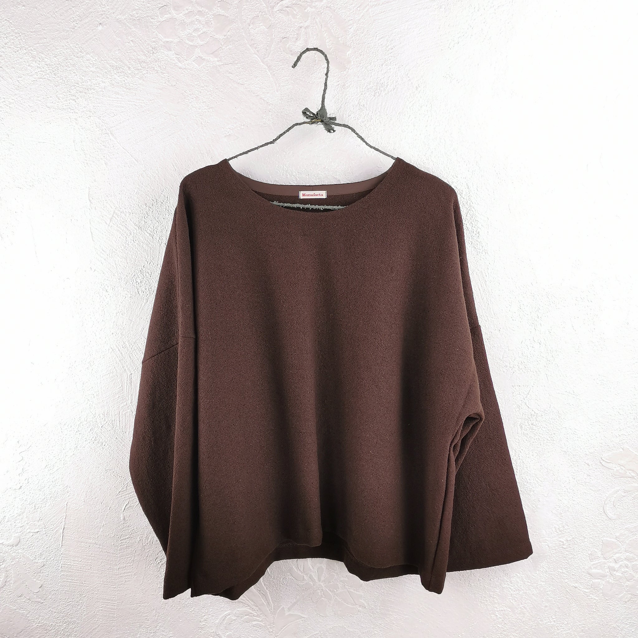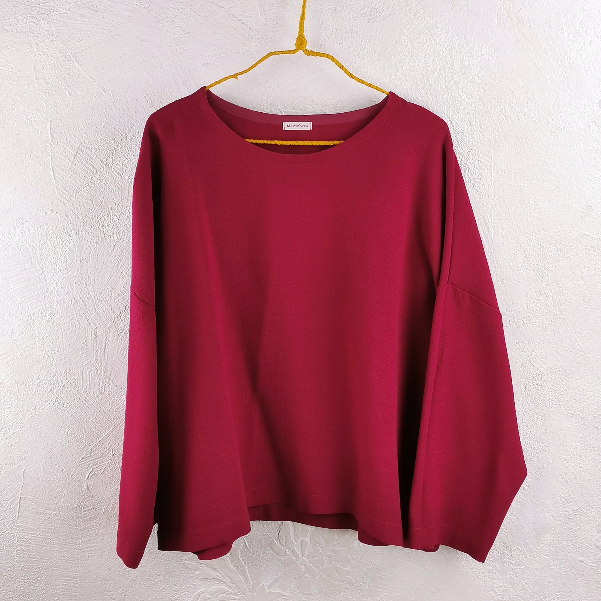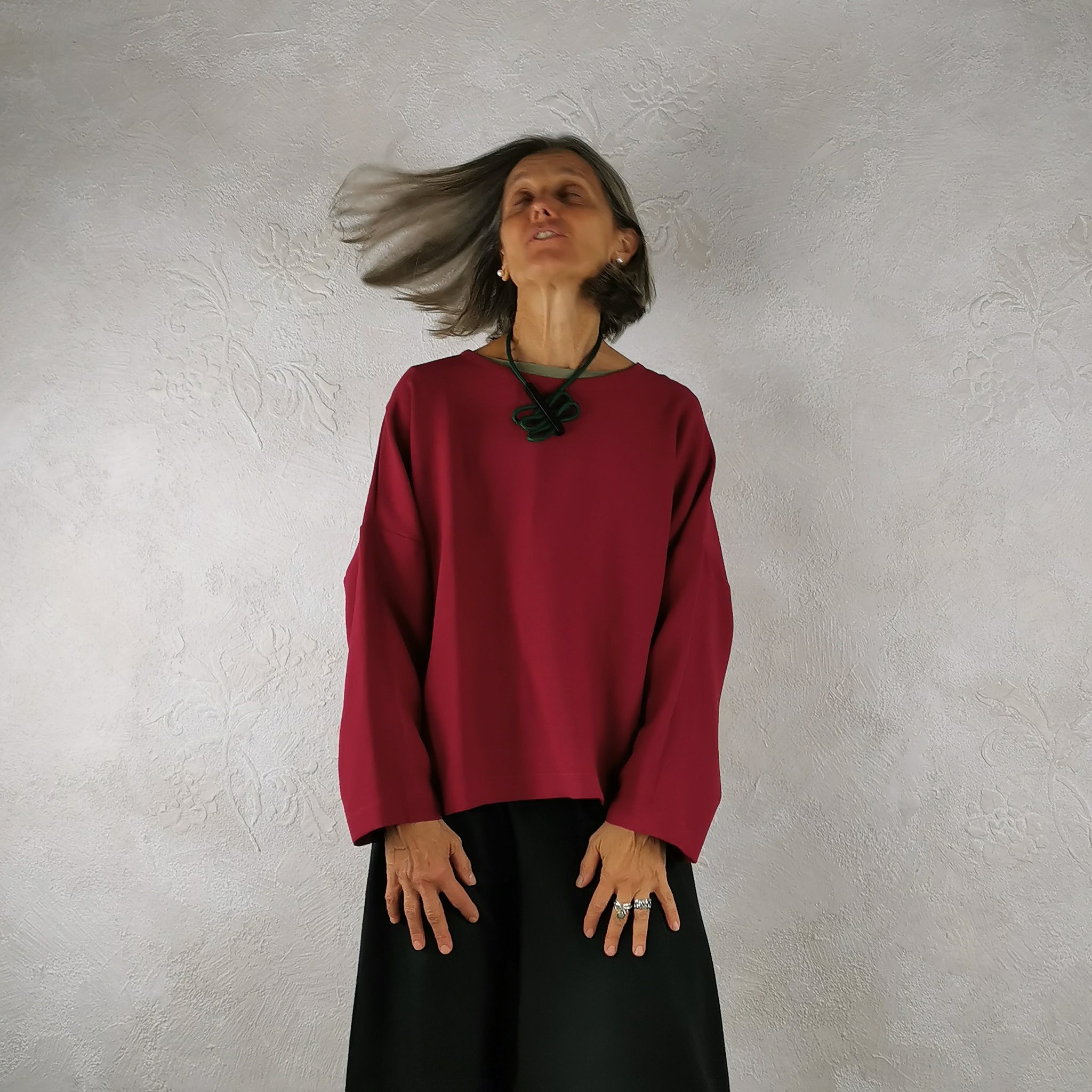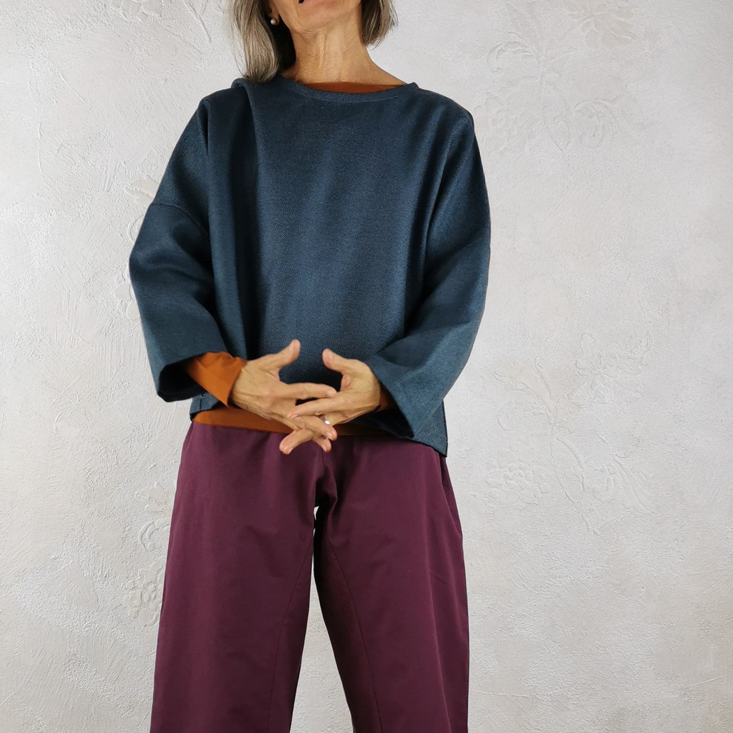 Maglia larga con collo tondo rifinito con bordino di cotone, la manica è lunga, un modello ampio che veste in modo morbido senza aderire, per questo veste donne di forme molto diverse. I tessuti sono tutti in lana 100 %. Questo modello si presta anche ad essere portato sopra alle " camicie dritte " della stessa collezione, che possono essere in mussolina di cotone o in lana leggera.