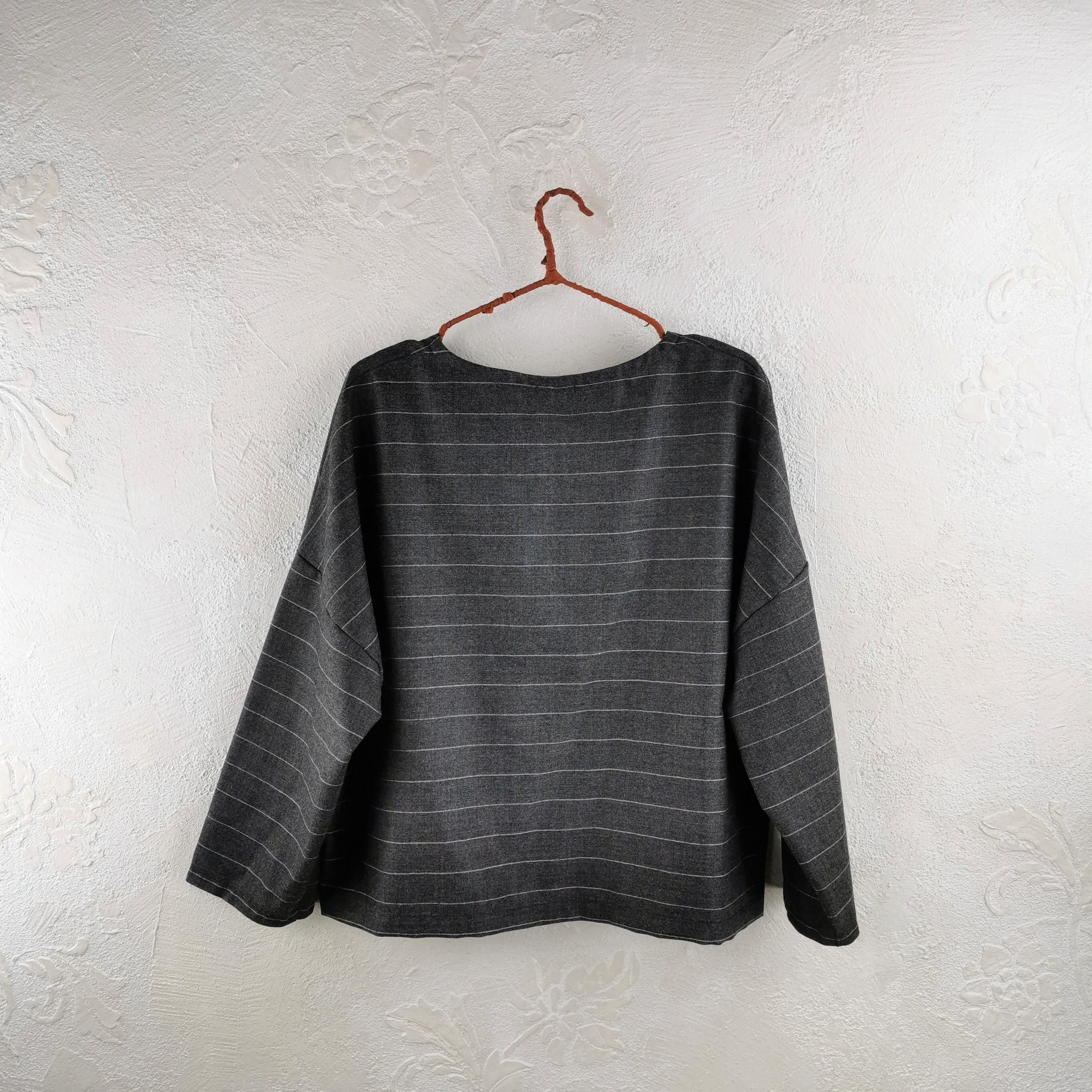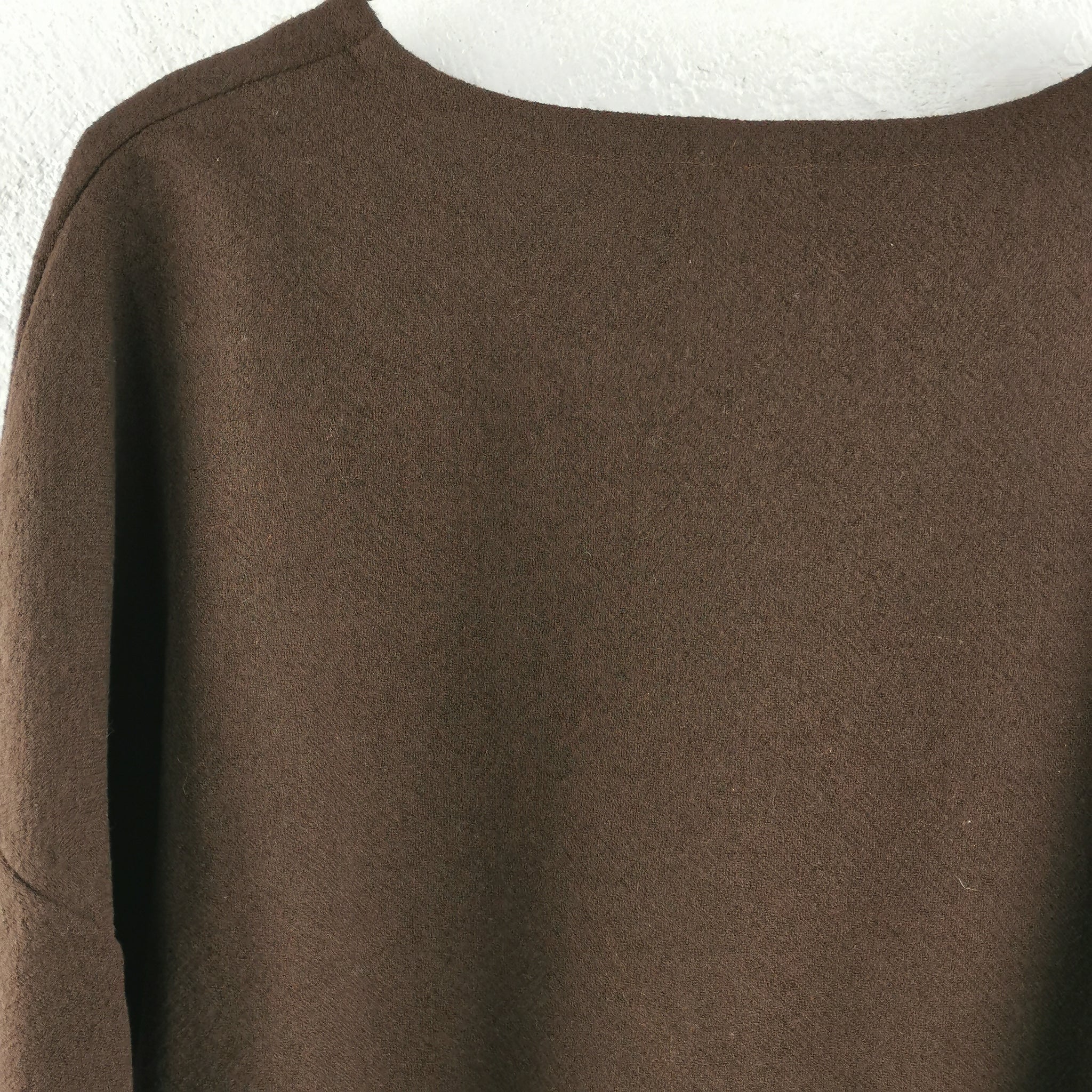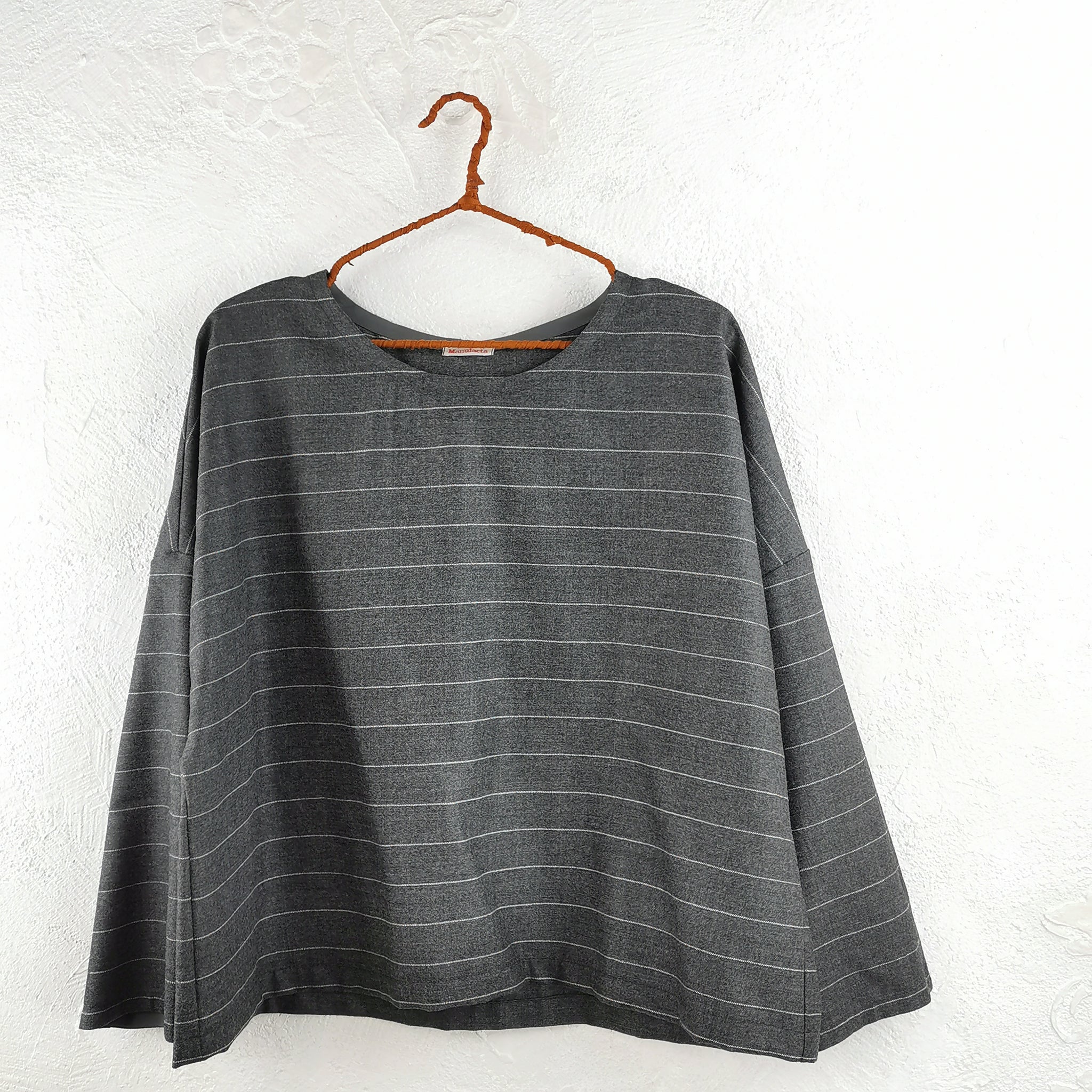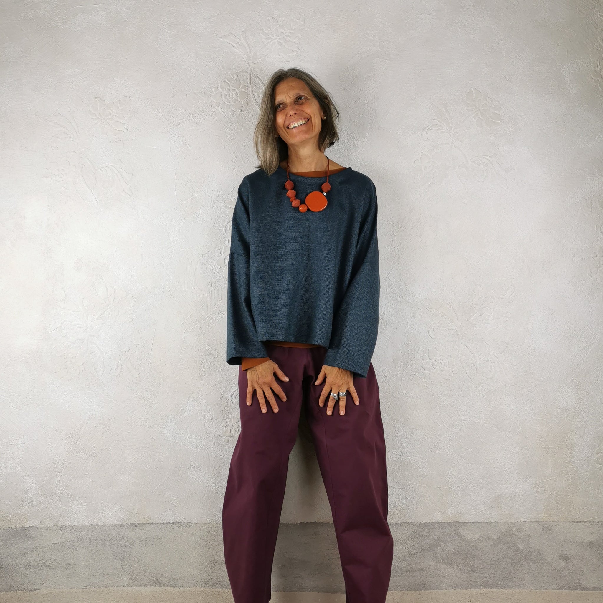 Maglia larga con collo tondo rifinito con bordino di cotone, la manica è lunga, un modello ampio che veste in modo morbido senza aderire, per questo veste donne di forme molto diverse. I tessuti sono tutti in lana 100 %. Questo modello si presta anche ad essere portato sopra alle " camicie dritte " della stessa collezione, che possono essere in mussolina di cotone o in lana leggera.