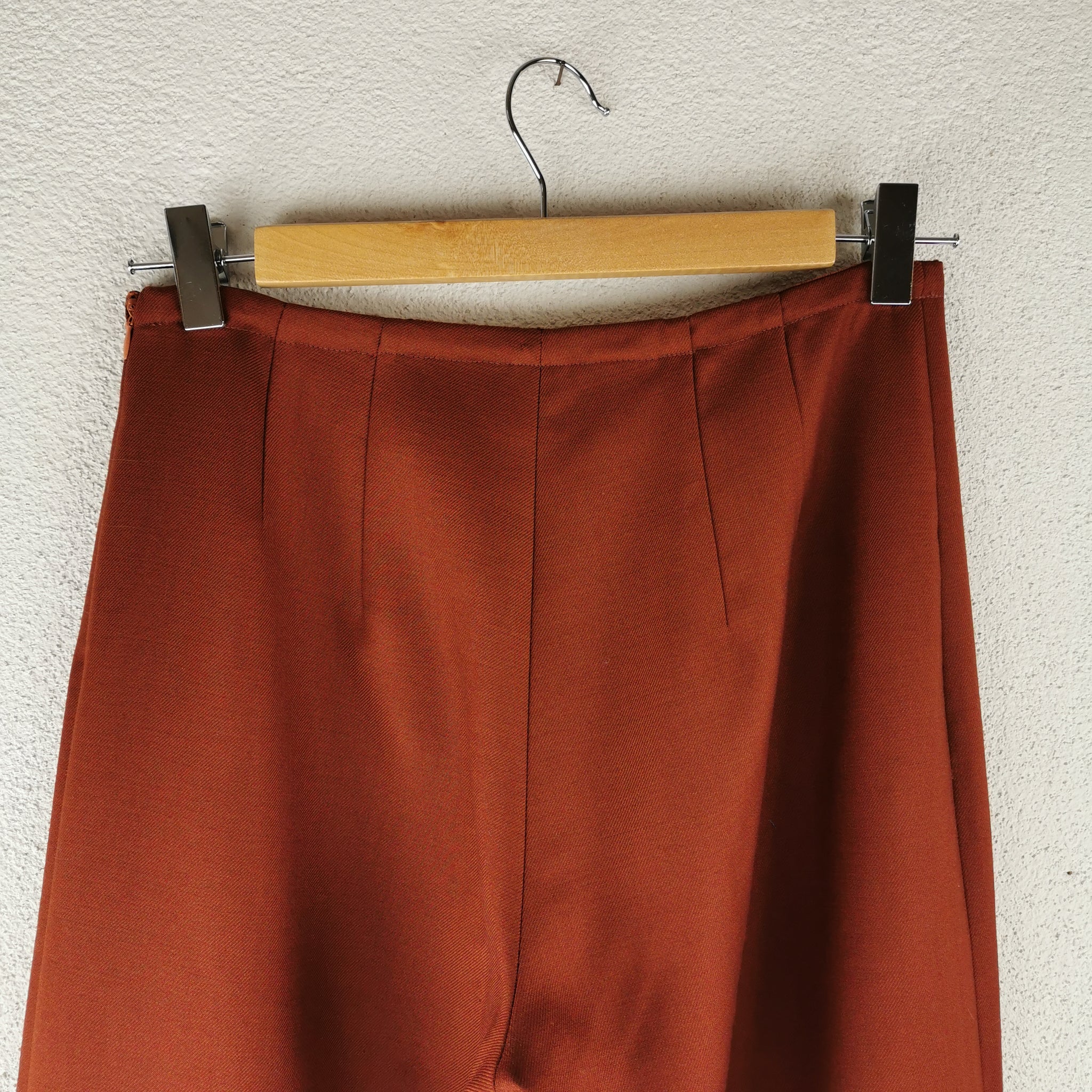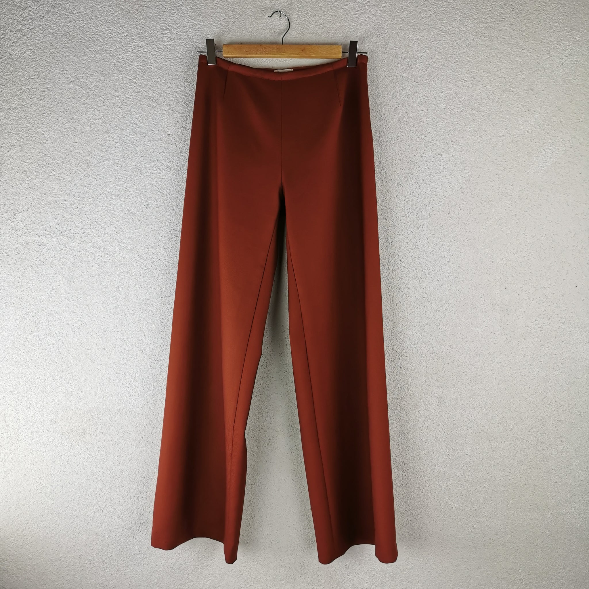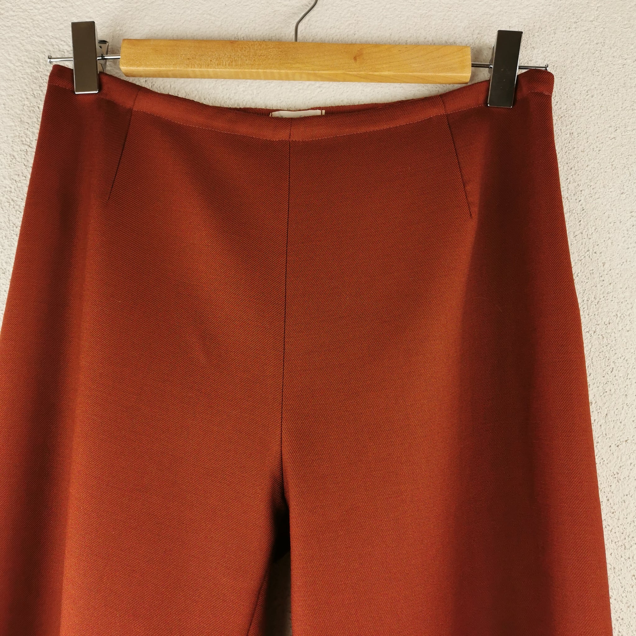 Pantalone dritto, in una bellissima lana color ruggine adatto anche alle stagioni calde. Modello con la gamba abbastanza larga, in vita rifinito da nastro di gros grain in cotone, con la cerniera laterale, permette una grande comodità e un'ottima vestibilità per forme diverse. Questo pantalone è stato realizzato a mano a Firenze per Manufacta.