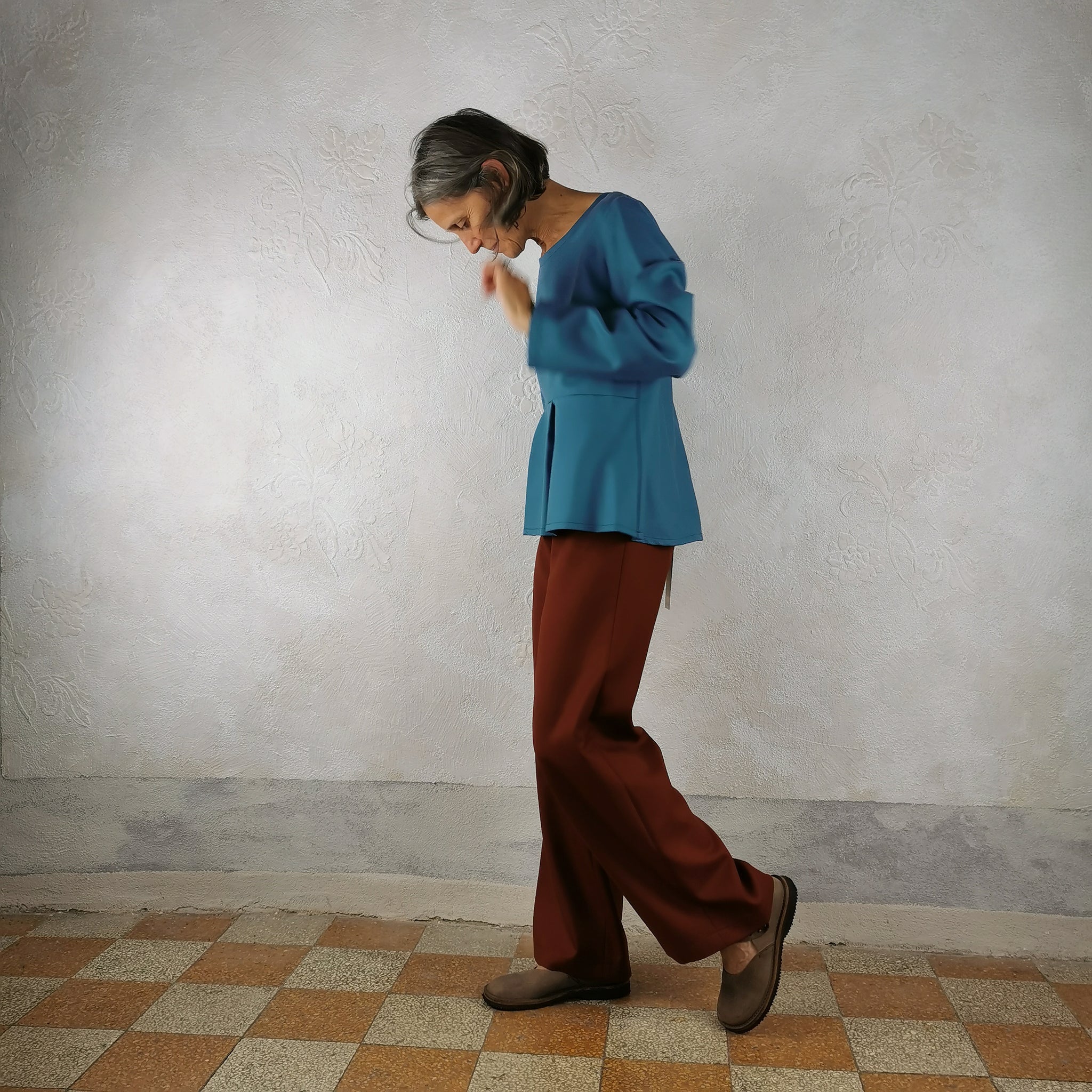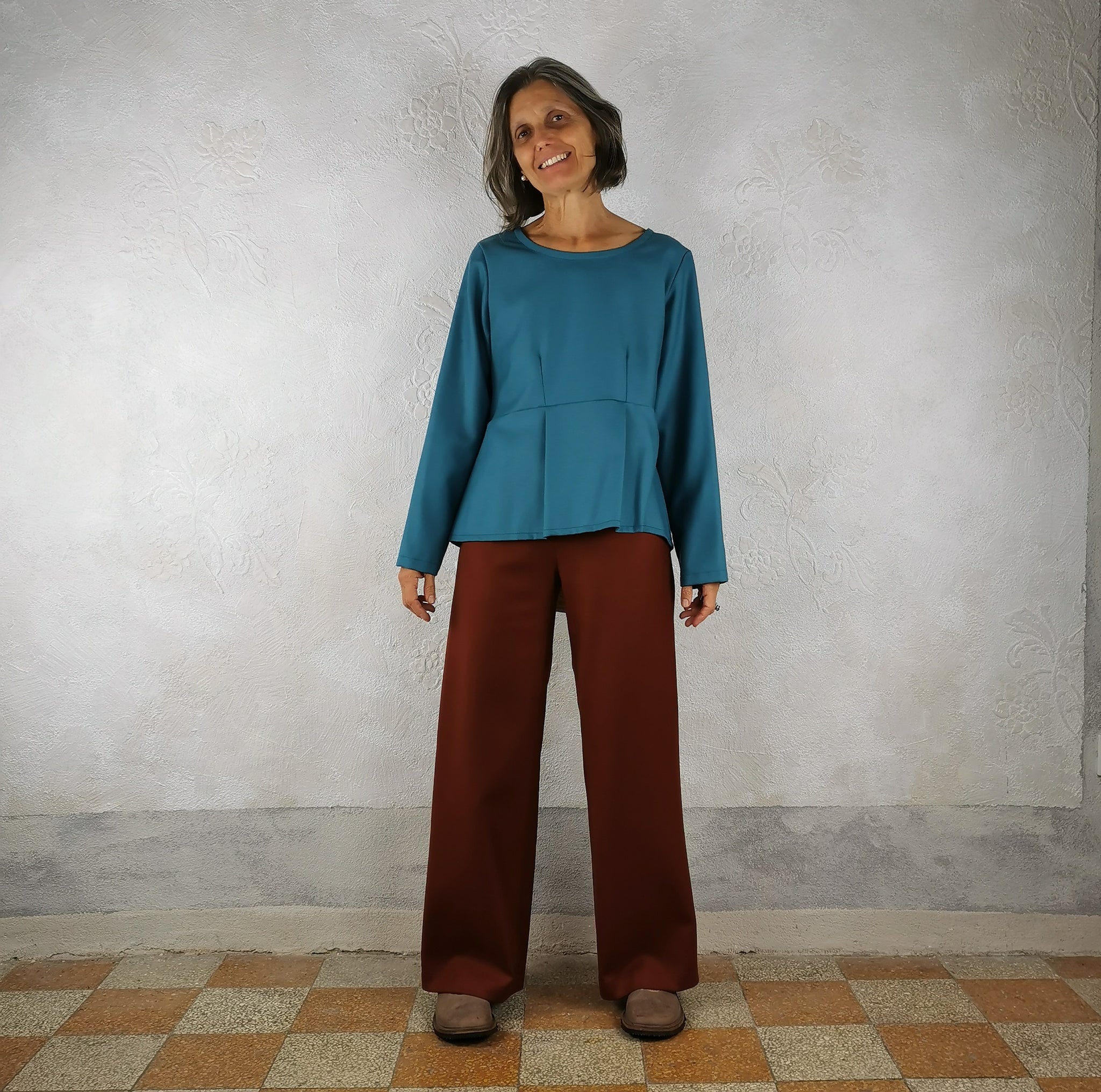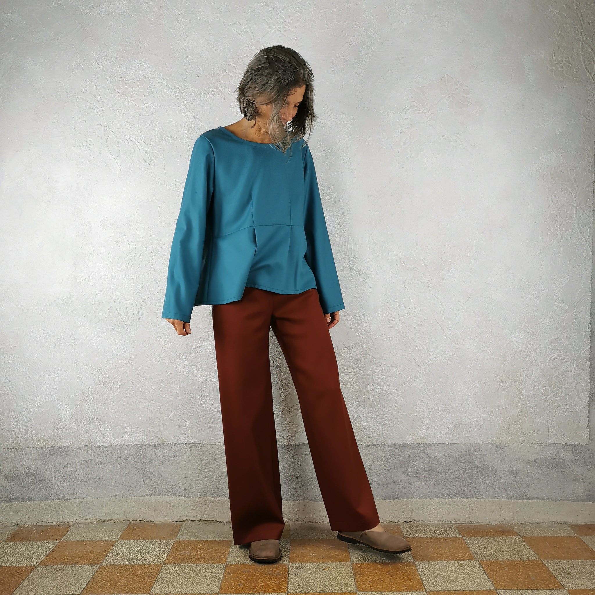 Pantalone dritto, in una bellissima lana color ruggine adatto anche alle stagioni calde. Modello con la gamba abbastanza larga, in vita rifinito da nastro di gros grain in cotone, con la cerniera laterale, permette una grande comodità e un'ottima vestibilità per forme diverse. Questo pantalone è stato realizzato a mano a Firenze per Manufacta.